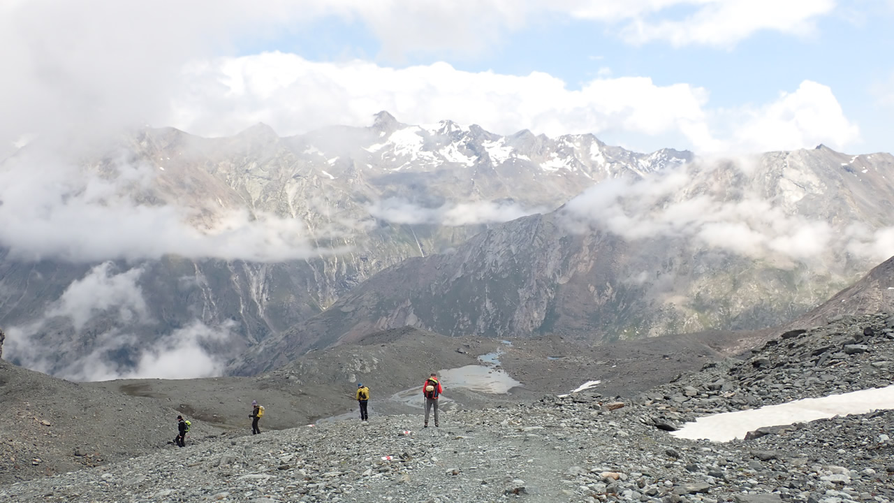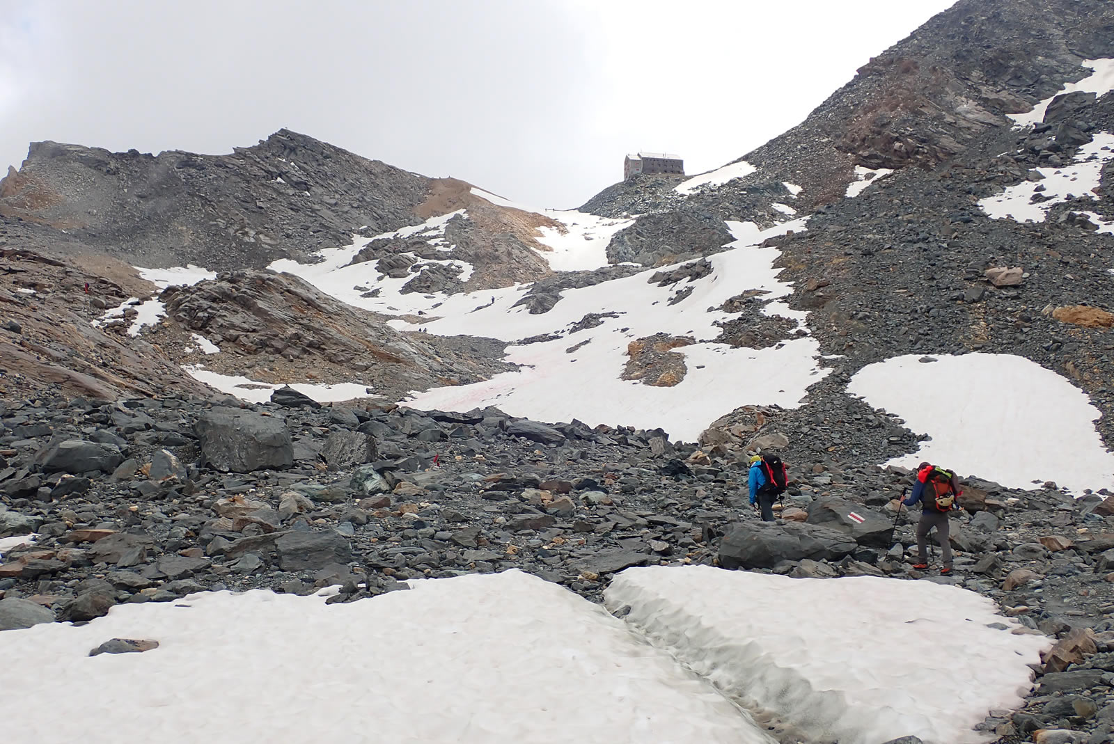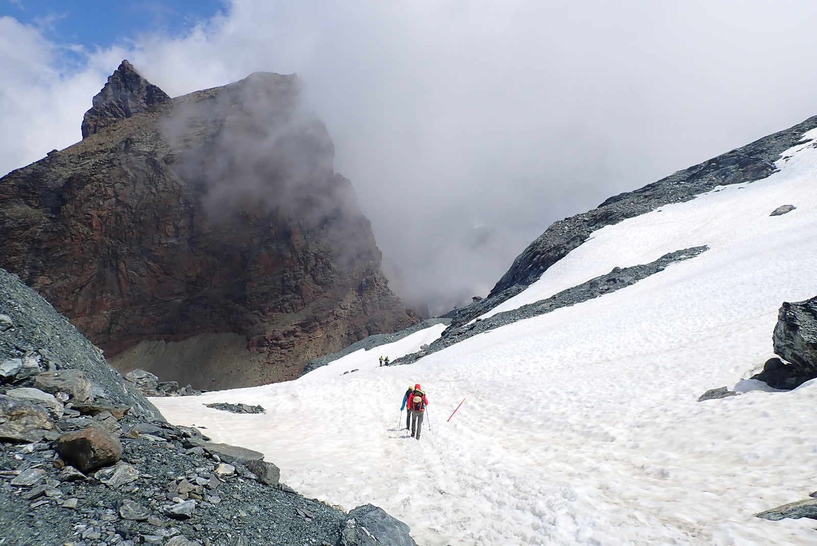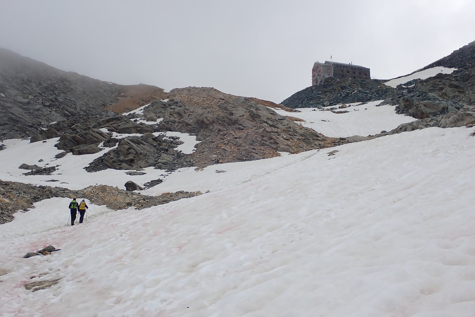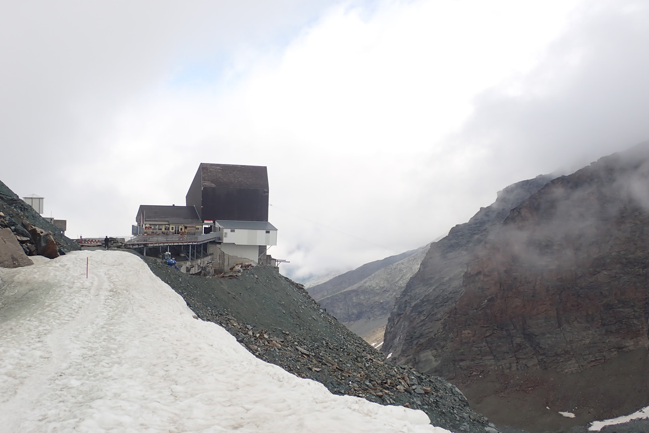 El teleférico pasa por otra estación a mitad de subida pero para en el más alto, Felskinn, a 2.988 mts. Salimos de la estación y ya sentimos el fresco de la alta montaña. El tiempo no mejora, está nublado y no vemos por completo el paisaje, pero parece que esta estación está en una especie de espolón con nieve o hielo a cada lado en bajada, es parte del glaciar que baja de las alturas del Allalinhorn. Un corto camino exterior enlaza la estación del teleférico de la estación del funicular, pero nosotros cogeremos un camino en la nieve que sale a la izquierda de la entrada al funicular y recorre en horizontal la montaña atravesando un nevero o glaciar en busca de un collado a la izquierda, el Egginerjoch, este camino será el que nos lleve hacia el Refugio Britannia. El día va mejorando, sigue habiendo nubes pero no precipita, y poco a poco el sol intenta imponerse en vano.