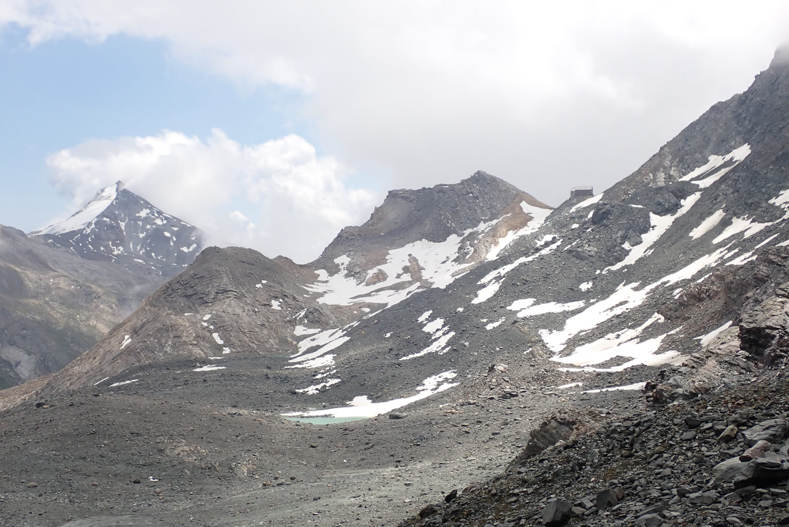 Desde el collado Egginerjoch, a 2.998 mts., podemos ver la otra vertiente del valle, la caída hacia la otra población del Saastal: Saas-Almagell. Enfrente del collado aparece una llamativa aguja o cima picuda, es el Egginer. Giramos la vista a la derecha, en la bajada de otro espolón o cresta, descubrimos la construcción del Refugio Britannia al fondo de una vaguada, pero en lugar de cruzar el largo y peligroso pedregal que baja de la montaña, seguiremos una senda que en un principio parece que se aleja en dirección contraria al refugio y en bajada, pero por unos laguitos más abajo, gira hacia la derecha en dirección al mismo refugio. Parece que es como coger el camino o ruta que viene de Saas-Almagell o el fondo del valle de Saas, sin coger teleférico… ya que hace 120 años no los habían construido y los clásicos montañeros subían a pié desde las poblaciones.
