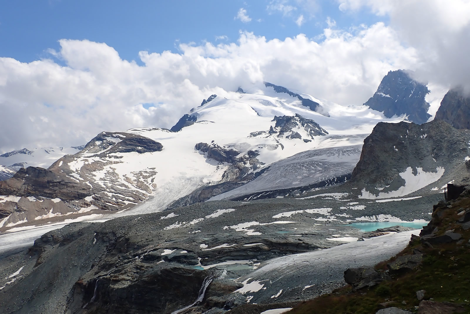 Desde el Refugio Britannia, 3.027 mts., abajo y derecha el Glaciar Hohlaub, en el centro e izquierda el Glaciar Allalin, a la izquierda el Fluchthorn y Strahlhorn cubiertos, el Rimpfischhorn en el centro y el Allalinhorn con su arista Hohlaub, a la derecha