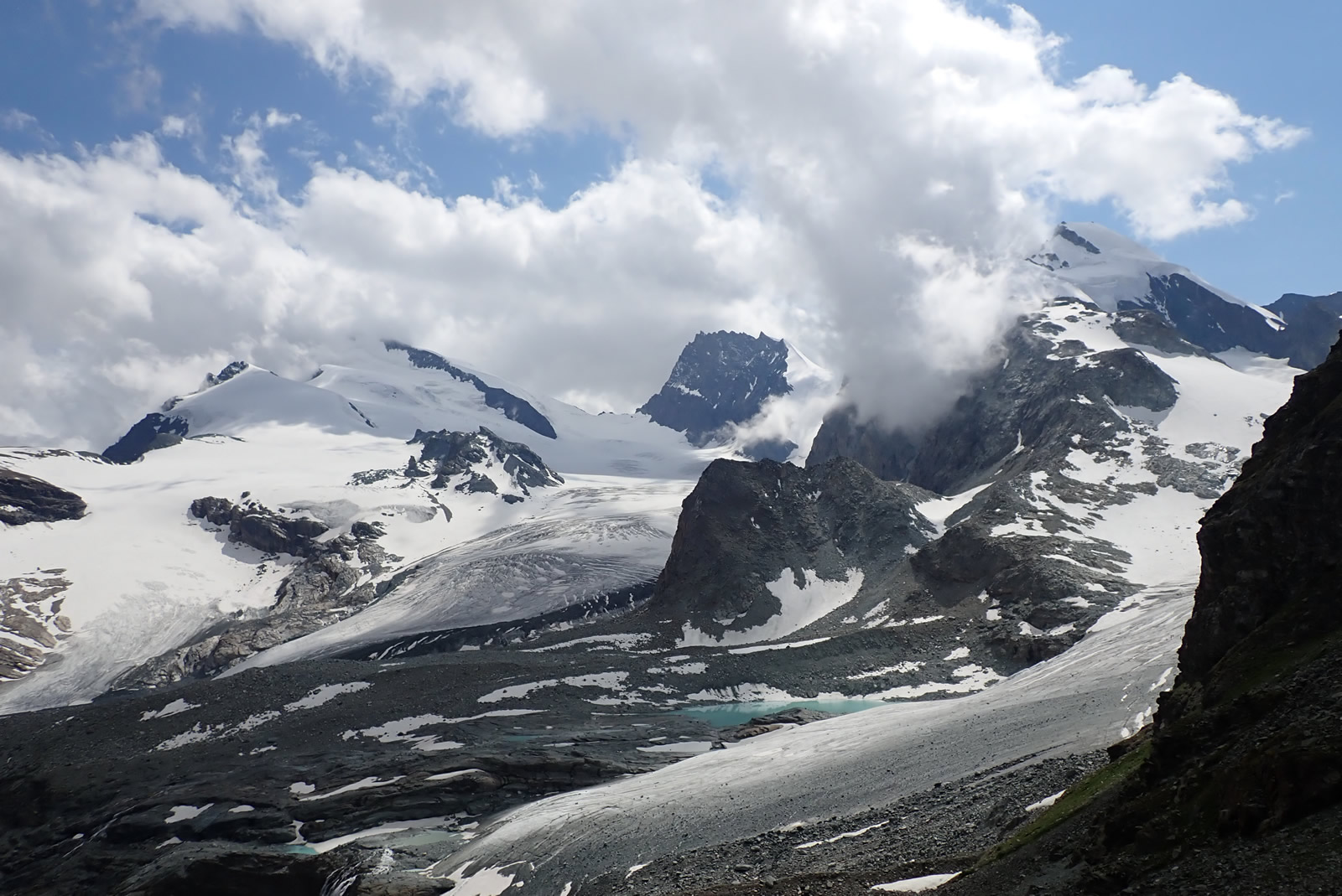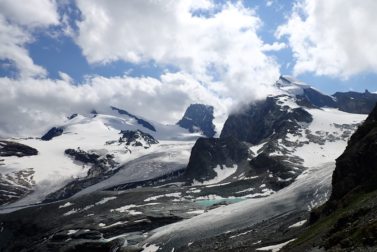 Desde el Refugio Britannia, 3.027 mts., abajo el Glaciar Hohlaub, en el centro el Glaciar Allain y en el centro el Fluchthorn y Strahlhorn. El Rimpfischhorn a la derecha