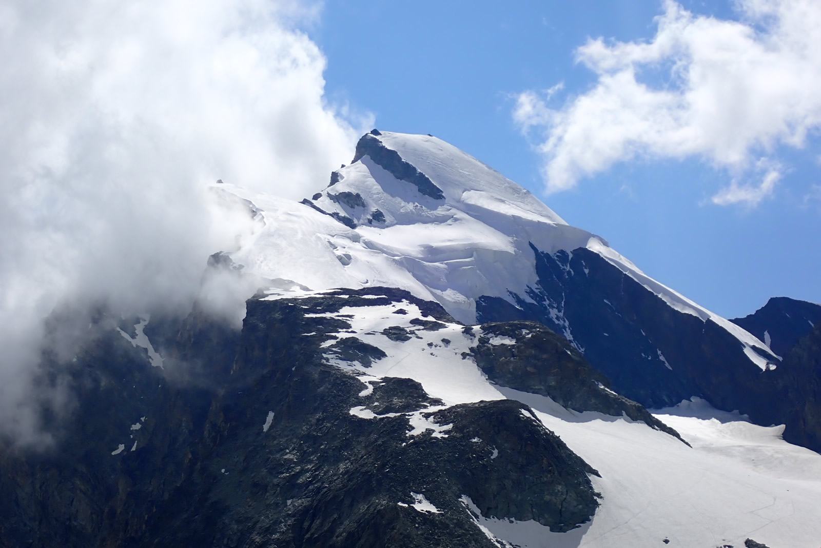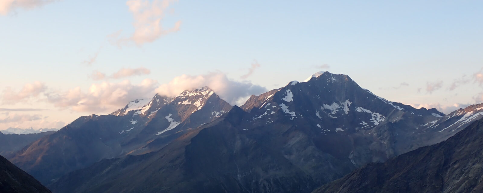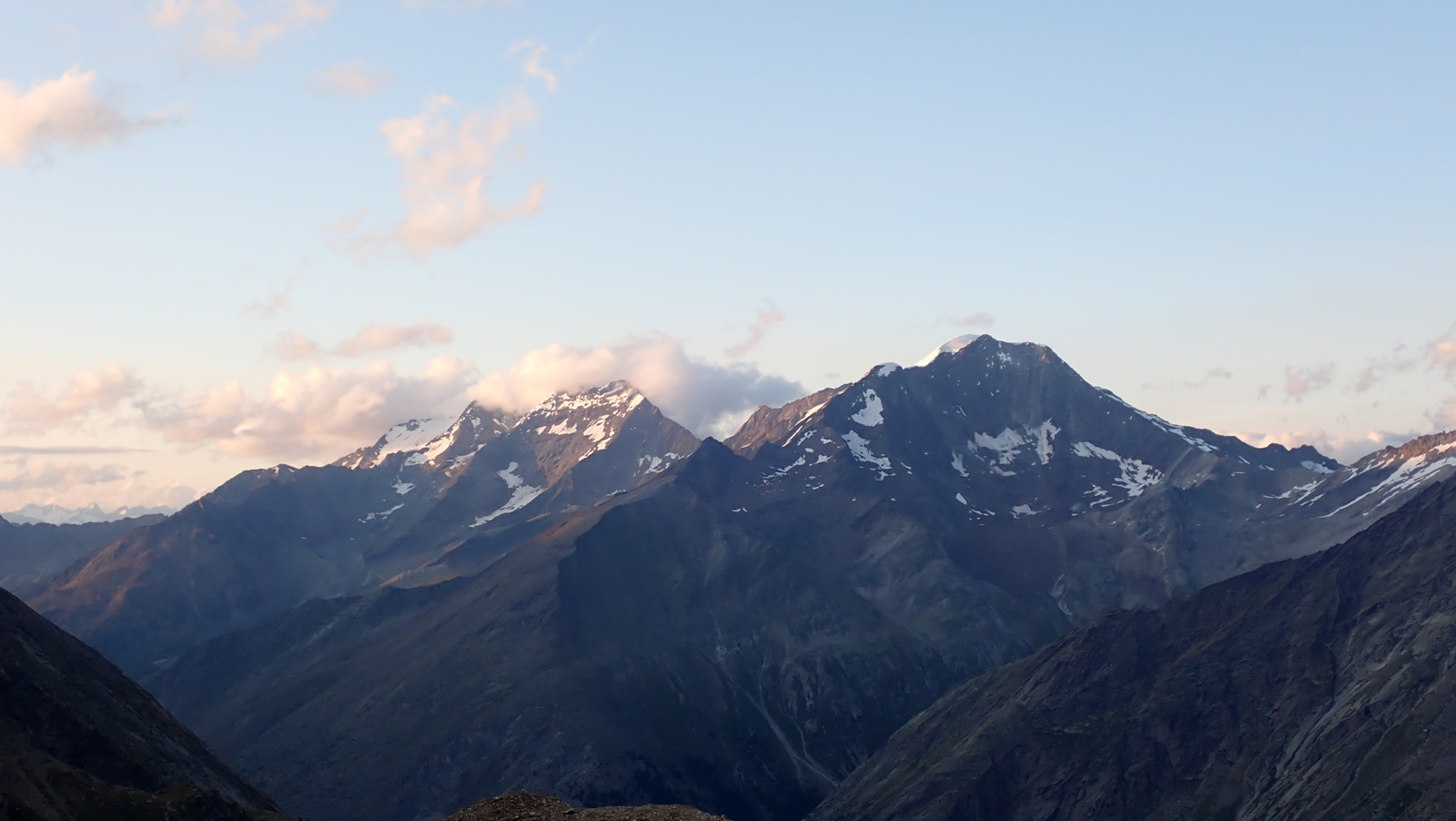Las vistas hacia al sur, al lado contrario por el que hemos venido, son impresionantes, pero me cuesta unos minutos reconocer las montañas y lugares que vemos. En general descubrimos el impresionante Glaciar Allalin que baja de las cimas del Strahlhorn y Fluchthorn. También aparece el encrespado y escarpado Rimpfischhorn; pero más a la derecha y casi oculto, tengo que subir algo a la ladera del Klein Allalin, para que se abra el paisaje, detrás del refugio y de la cresta Hinter Allalin, aparece nuestro objetivo, el Allalinhorn, con su característica cima en el que aparece un paso de roca que la parte en dos, y hasta la cual sube una cresta entre fácil, llena de neveros y poca roca, y, más cerca de la cima, una inapreciable cresta helada, casi puntiaguda y más temeraria… es la Hohlaubgrat. Bajo esta montaña, el glaciar del mismo nombre, el Hohlaub… al atardecer las montañas se van despejando y el paisaje coje un tono romántico y a la vez desafiante, tenebroso, una mezcla sensacional en la alta montaña. El tiempo mejora. Mirando hacia el norte, casi al contrario de las vistas hacia el Strahlhorn, al fondo y al otro lado del valle, aparece un murallón alto y espectacular. Le pregunto a un montañero en inglés si aquella montaña es el Weissmies (nuestro segundo objetivo) pero no tiene ni idea de las montañas que ve al su alrededor… yo creo que sí es el Weissmies (al final sí que lo será).