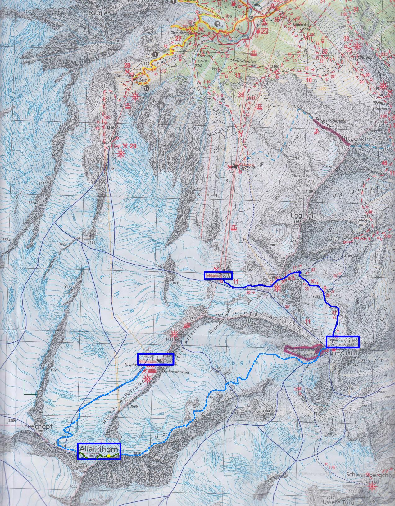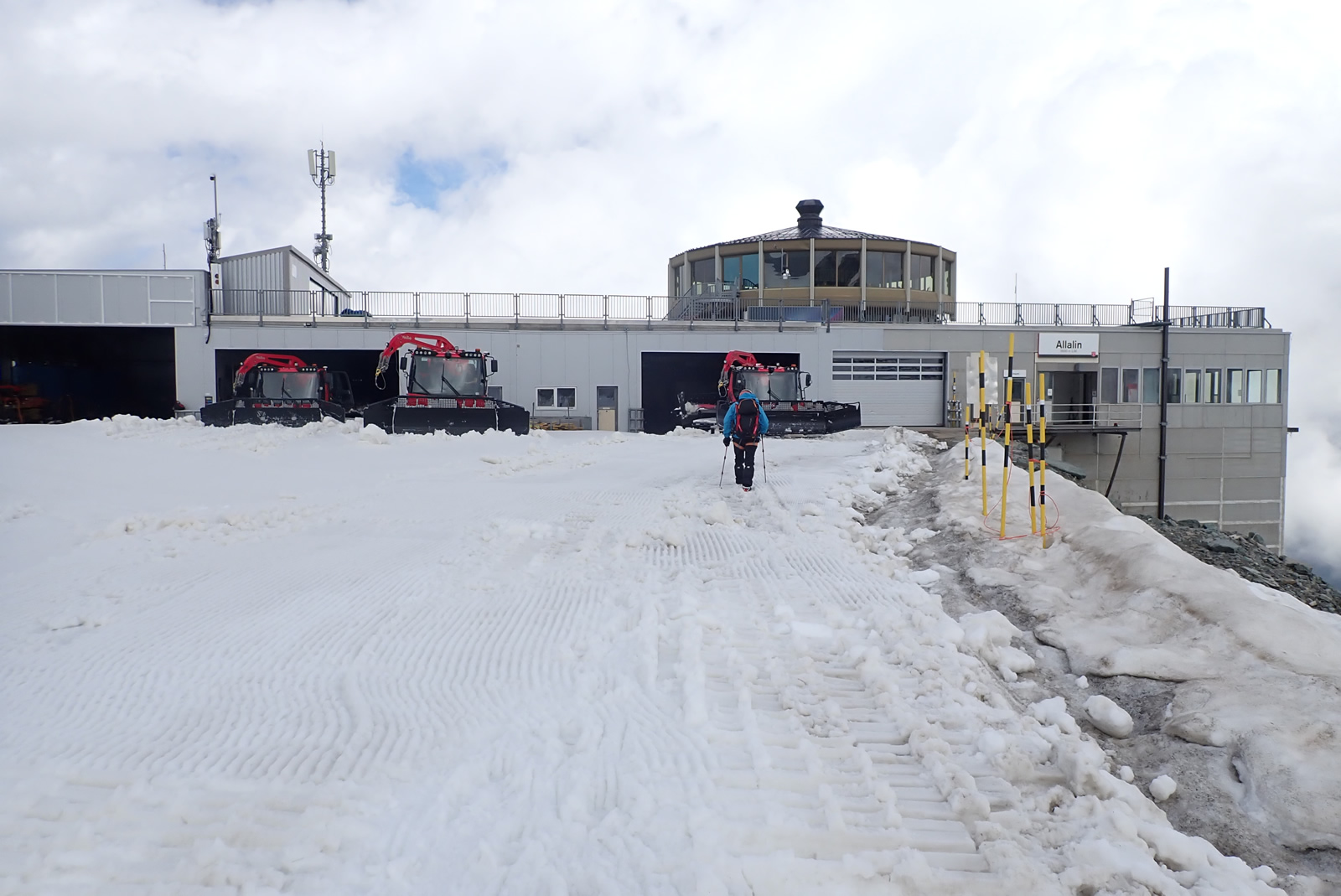 La senda en la nieve o las trazas del recorrido es muy evidente, y a pesar de que es una ruta fácil, también hace un zigzag entre grietas y seracs del espectacular glaciar. Llega un momento que bajamos a un camino de nieve, donde las quitanieves pasan por él para dirigirse a cada punto del casi llano glaciar para planchar la nieve y hacer las pistas. Jordi se ha adelantado y ya está subiendo en dirección a la entrada del Metro que queda poco más a la derecha, justo al noreste del pico, Francesc va detrás y yo el último, retraso por mis necesidades en el Feejoch. Curiosamente dichas máquinas se mueven en dirección al Metro, ya se retiran, debemos llegar a la vez que ellos o cerraran el funicular, tendremos que bajar por el glaciar y no llegaremos a tiempo para coger el último teleférico a Saas-Fee, con lo que casi corremos entre la abundante y blanda nieve para llegar a la entrada del Funicular.