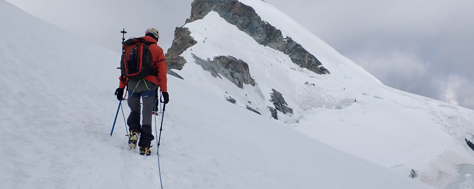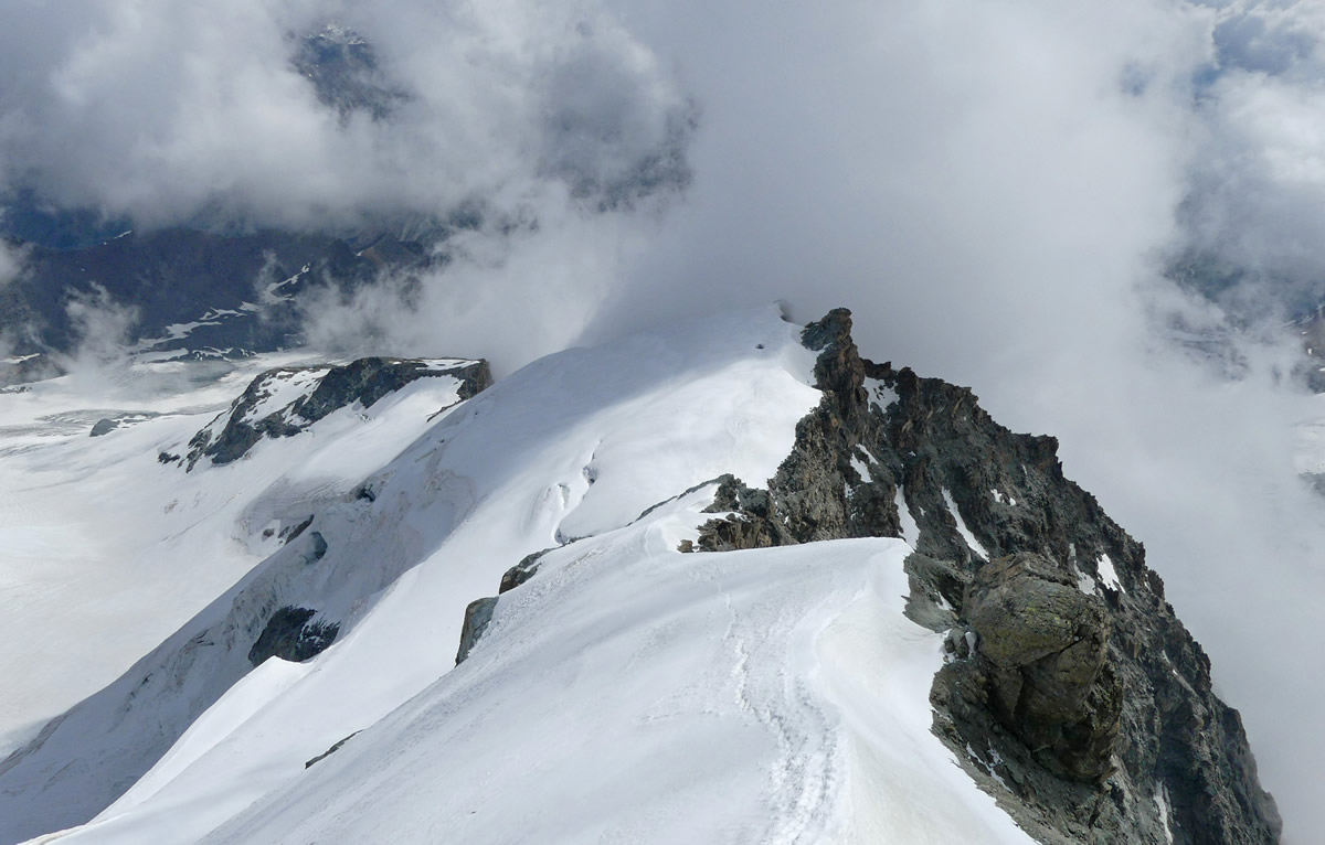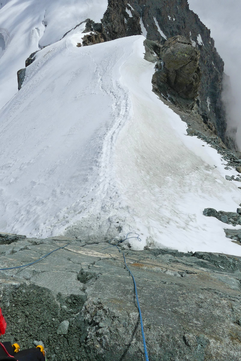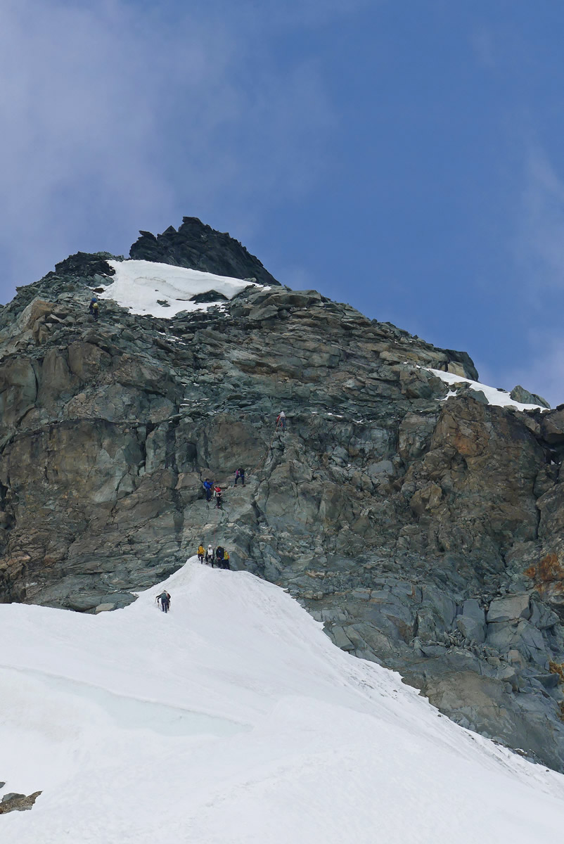 Después la parte mas fácil combinando palas de nieve y terreno pedregoso, casi rocoso, con muchas partes horizontales, nos topamos con una gran pala de nieve redondeada, casi cilíndrica, con forma de empinado domo y bastante vertical, bastantes metros a salvar hasta su cima. El recorrido es mas esforzado, mas vertiginoso, hasta la parte alta de esta primera altura, que es el comienzo de la afilada cresta de hielo, nieve, con algunos escalones de roca. Justo aquí arriba podemos descansar, hacer fotos al espectacular paisaje, sobre todo hacia el sur, hacia el Strahlhorn, su zona y el blanco y extenso Glaciar Allalin; y de lo que nos quedaba de subida: la cresta Hohlaub, la parte mas alta y helada, que se afila son ser vertiginosa pero sí sorprende la verticalidad de sus breves flancos, y la barrera rocosa con el paso de IIº que no paro de mirar, a ver por donde pasa la gente, los montañeros, lo que hacen, como se mueven, para imitarlos; y justo arriba la cima de la montaña.