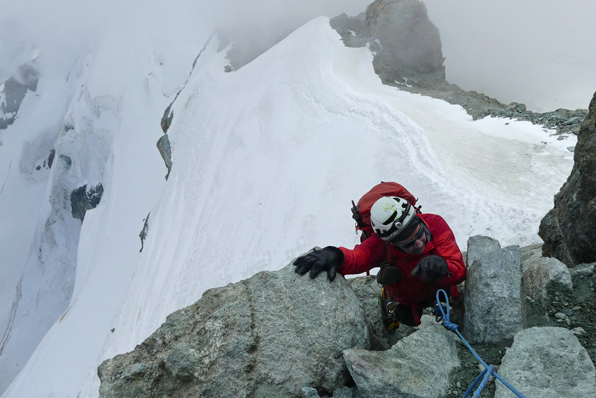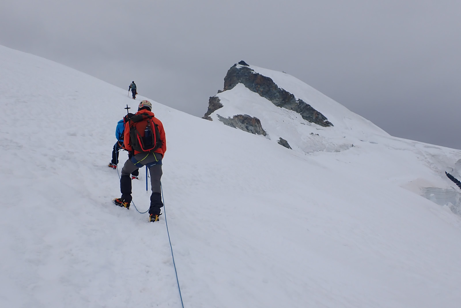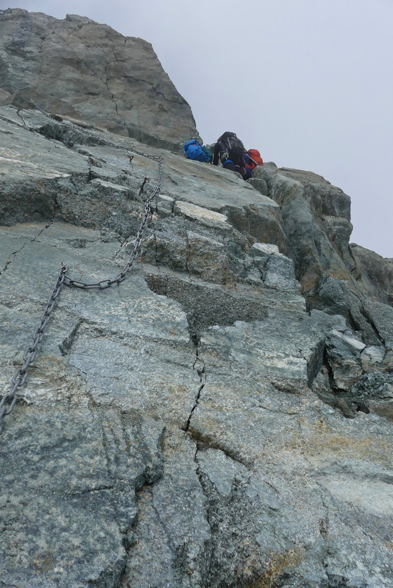 Después del paso transversal, donde los crampones arañan sin piedad la roca, hay una especie de pequeña chimenea con superación por peso hacia arriba que nos deja en un tramo de la pared con menos inclinación, pero con terreno entre rocoso y resbaladizo, como en terraza de unos 45º o 50º. La cadena hacia una L al revés, en vertical al principio y luego aseguraba un paso de rocas mas lisas. Hay agarres buenos pero no es un paso de IIº. Además estamos subiendo sin quitarnos los crampones. A pesar de ser un sitio mas fácil, Francesc prefiere ir asegurando la progresión, intentando hacer un nudo dinámico en el mosquetón para hacer de seguro, e instalando alrededor de las rocas, de algún seguro que encontramos, algún parabolt. Se ha empeñado en ser él el primero y subirnos por este terreno tan inestable… cualquier resbalón y caemos por la pared que hemos subido, después por las verticales pendientes heladas de la cresta Hohlaub, y después saldríamos disparados por las paredes de sus seracs. Hace varias reuniones, pero de verdad que el terreno no es tan peligroso, hay que llevar atención. Curiosamente los guías han seguido asegurando en esta parte de la montaña igualmente.