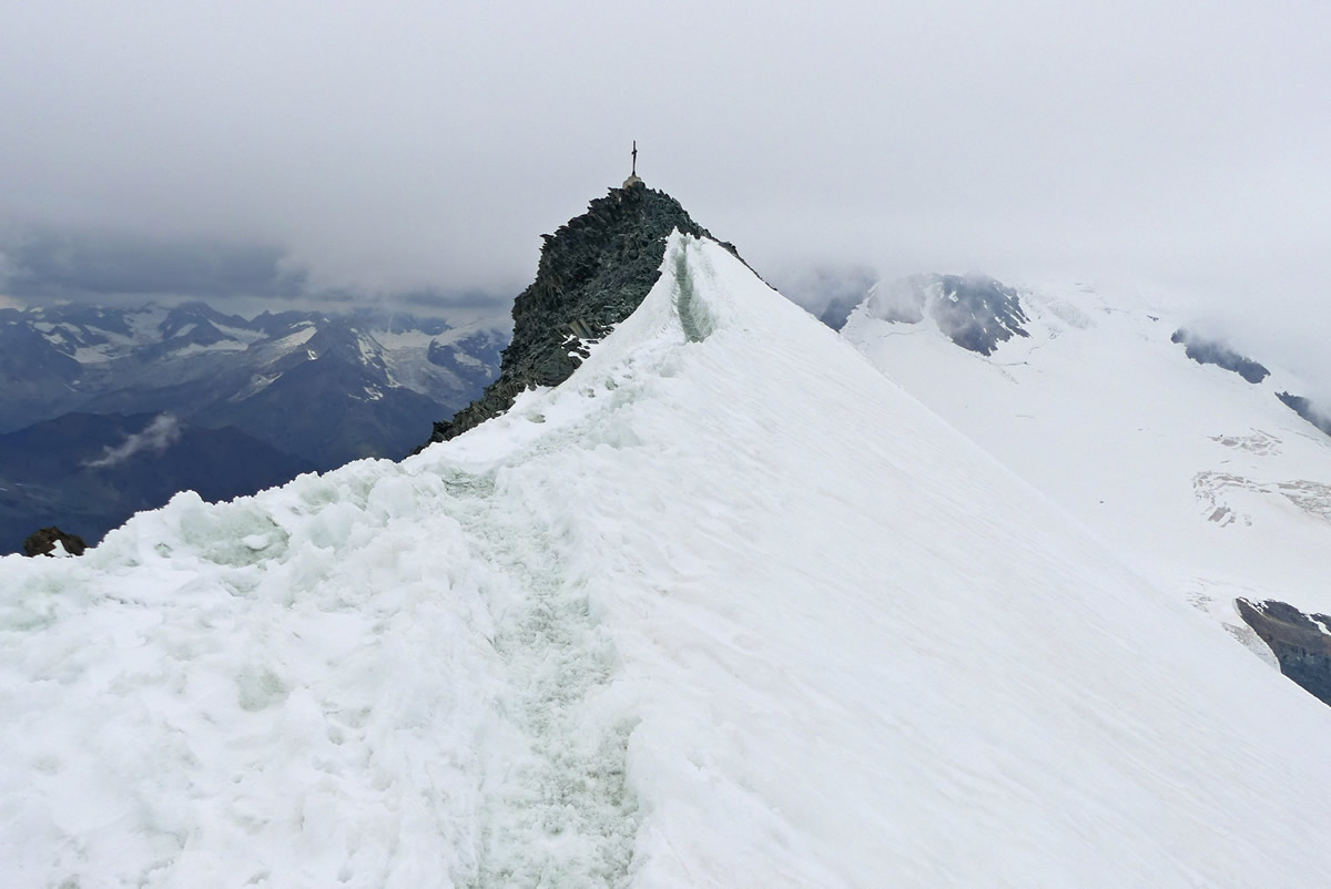 El tiempo ha ido empeorando, se ha nublado el cielo pero aún, de tanto en tanto, nos deja ver las magníficas vistas alrededor de la cima. Estamos solos en la montaña, ya ha pasado todo el mundo y ya han bajado de la misma. Después de un pasillo fácil en la nieve, llegamos a la cruz de la cima del Allalinhorn, 4.027 mts., son las 14:00, hemos tardado 10 horas desde la salida del refugio.