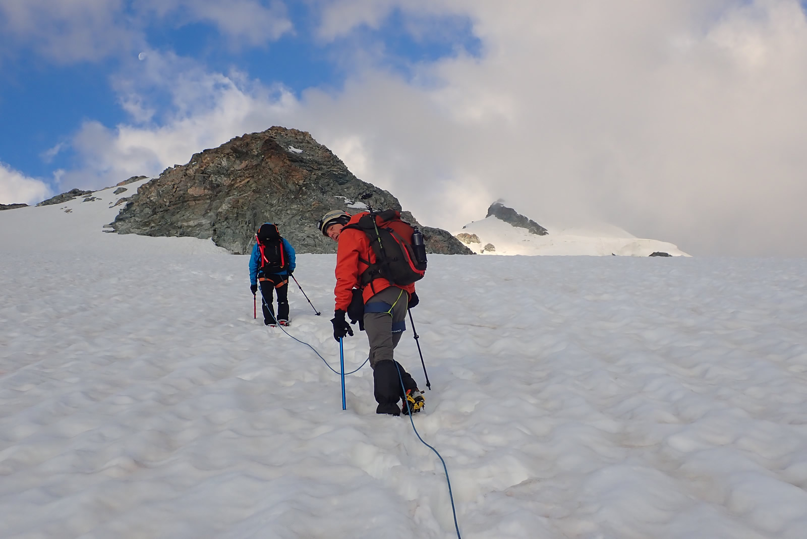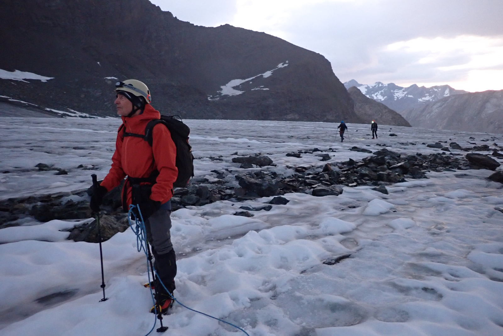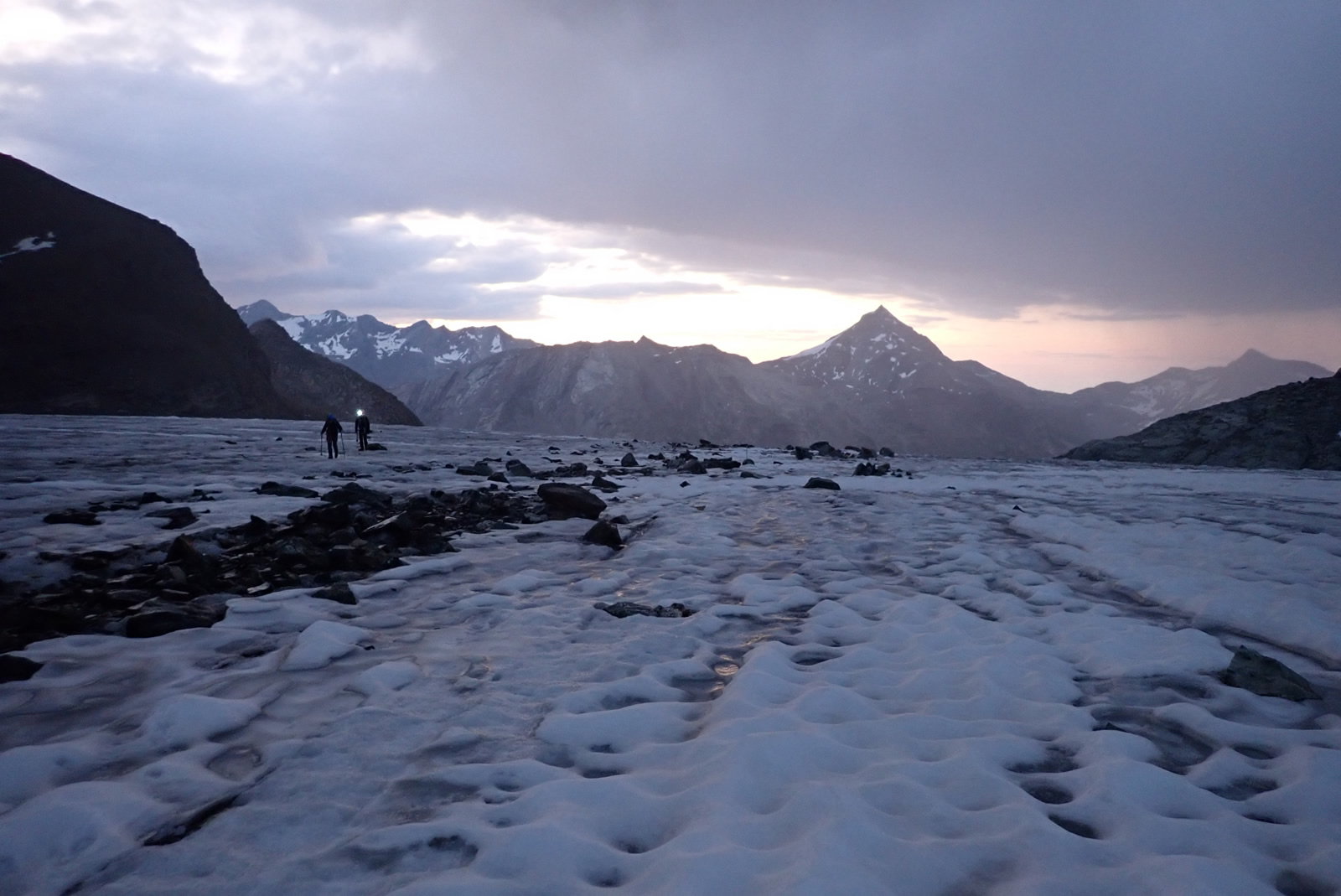 Ya comienza a amanecer y vemos poco a poco los perfiles de la montaña: al otro lado del horizontal glaciar hay unas palas de nieve entre rocas o zonas rocosas, quedando más a la derecha la parte mas escarpada pero nada peligrosa (en esta parte baja) de la cresta Hohlaub, la que separa las vertientes. Solo tenemos que seguir los pasos y subir por las huellas estas palas de nieve que, poco mas arriba, la montaña se suaviza y se horizontaliza en un punto.