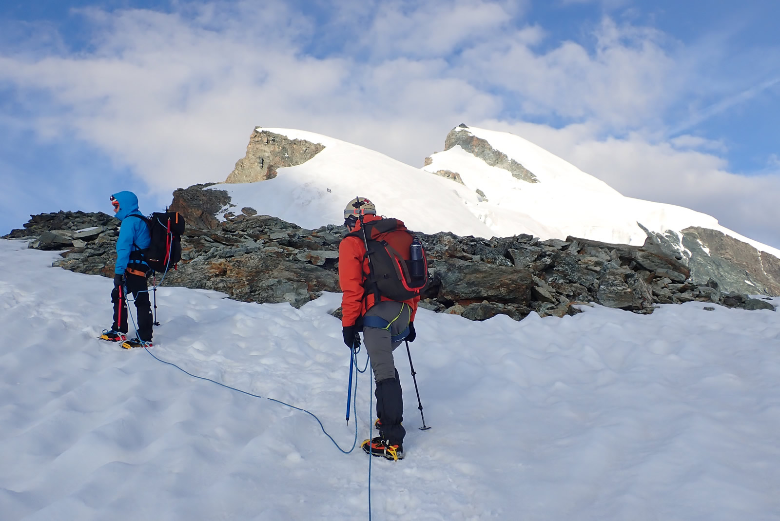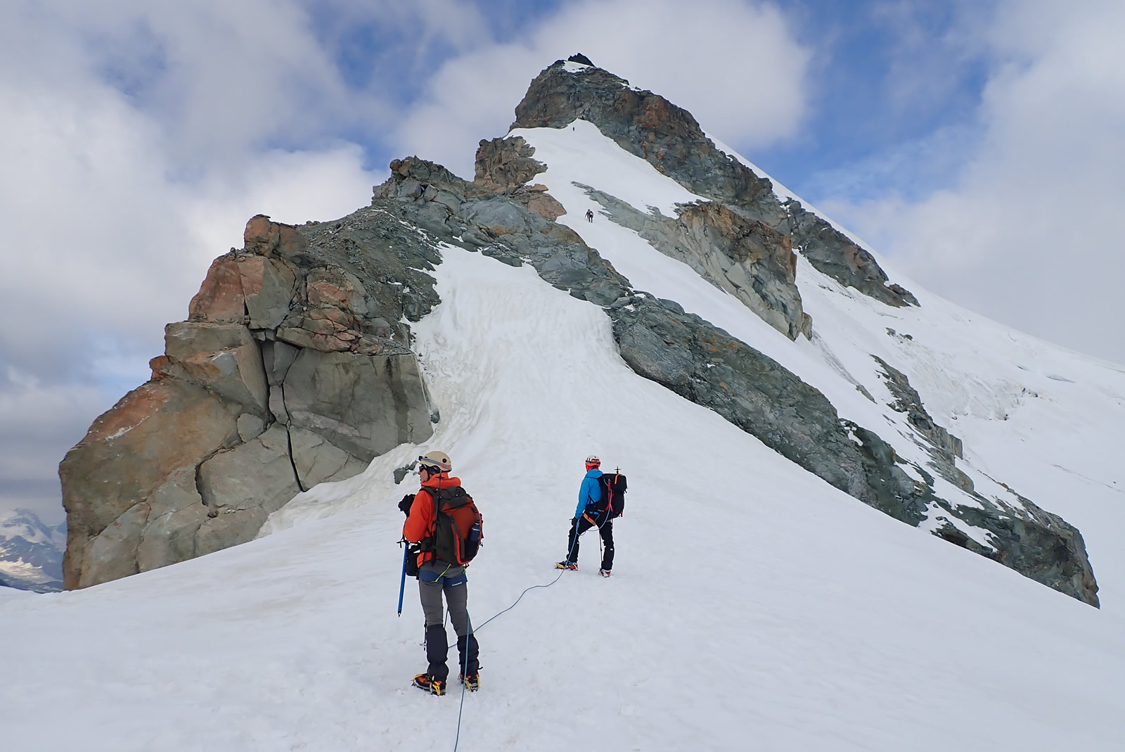 Francesc y Jordi subiendo a la arista Hohlaub y la cima del Allalinhorn con su paso de IIIº, delante