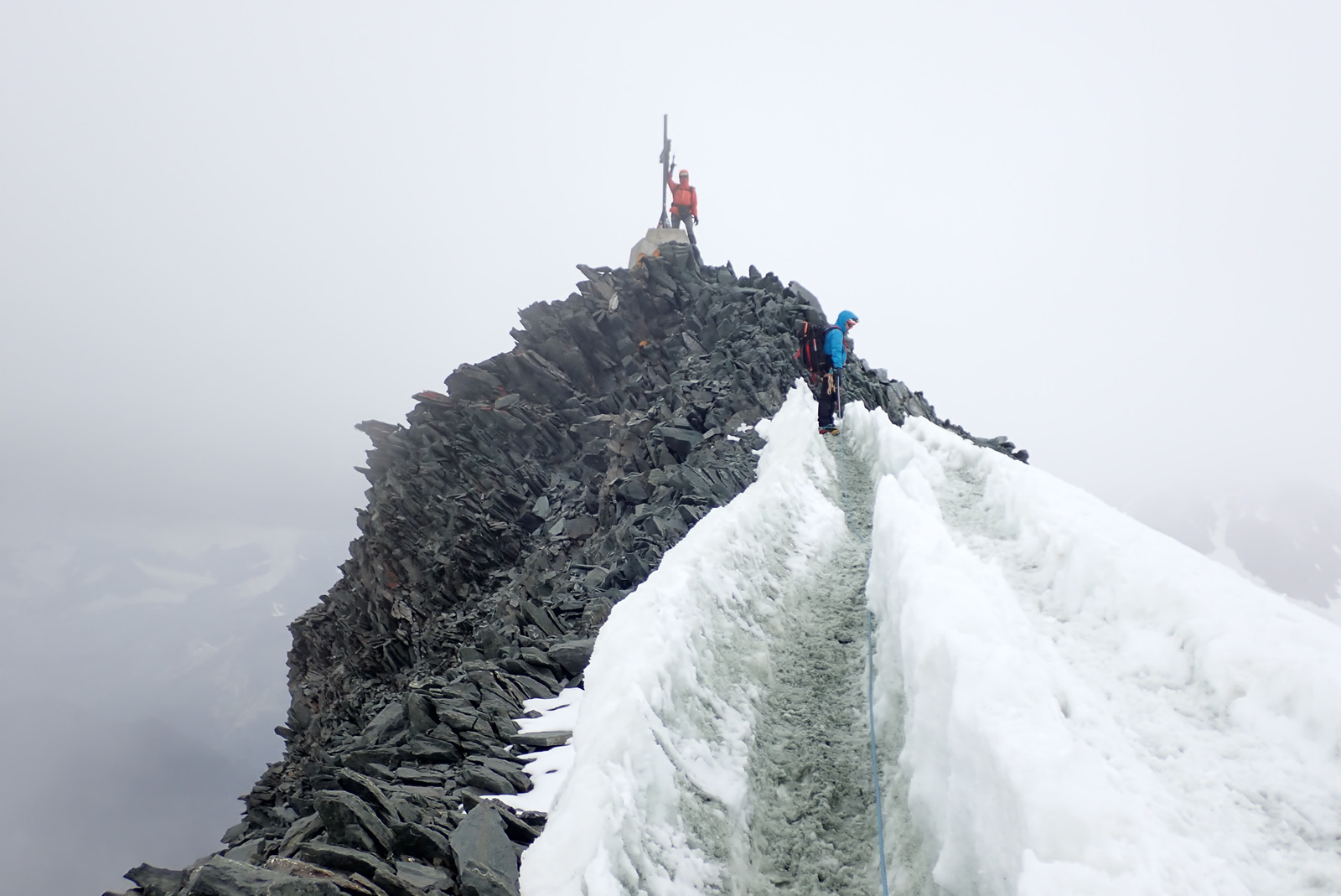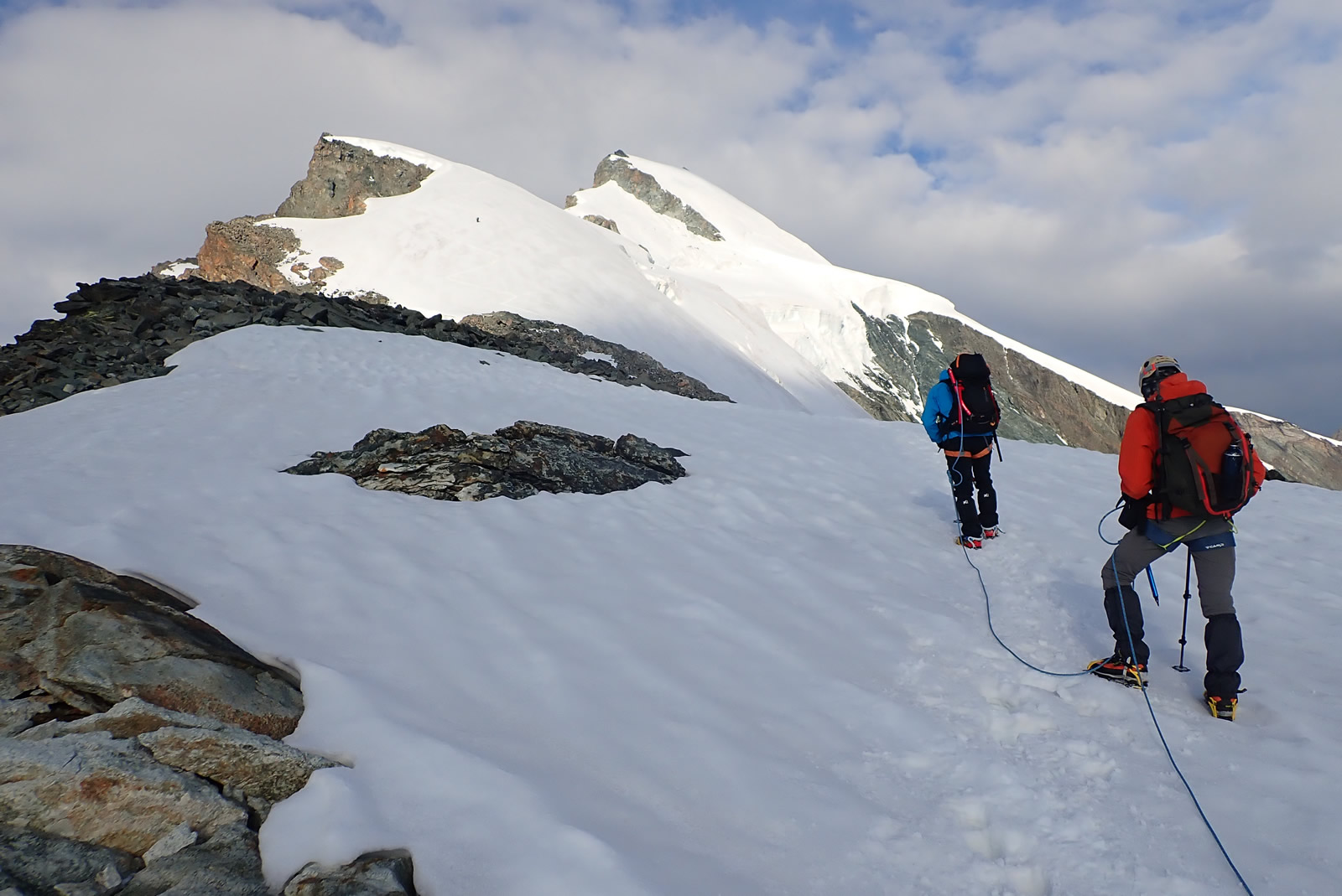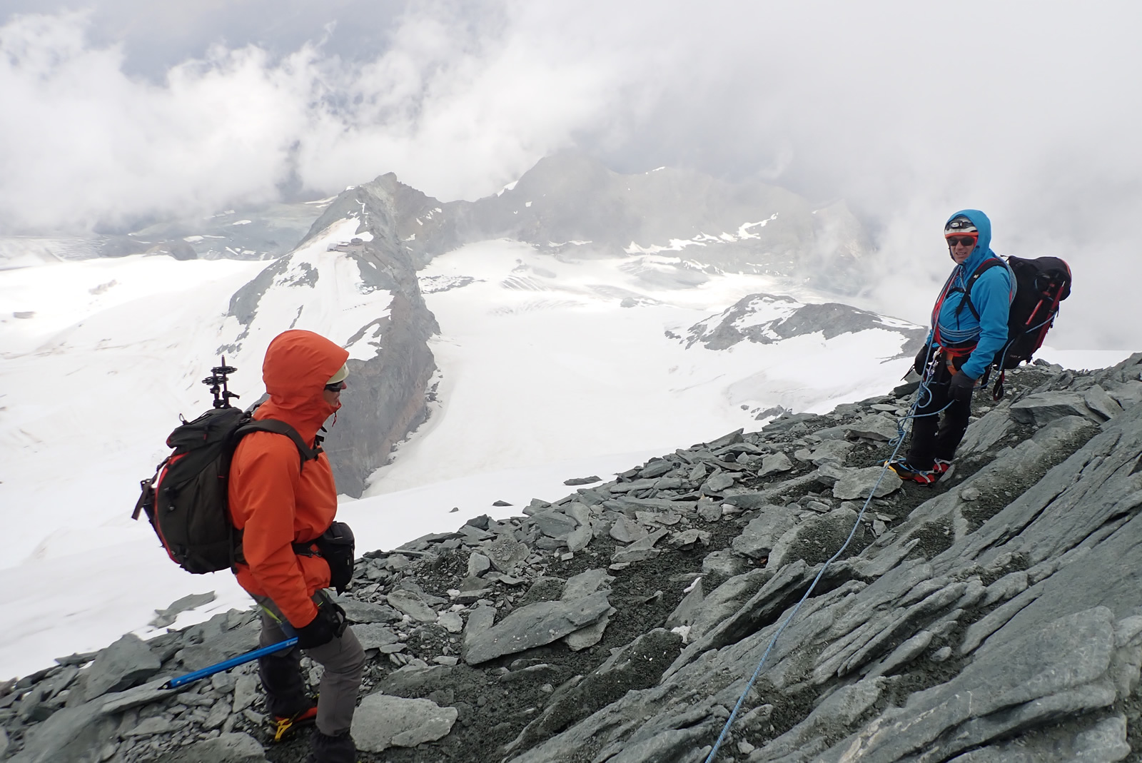 Francesc y Jordi subiendo al cordal de la arista Hohlaub, la misma arista a la izquierda y la cima del Allalinhorn en el centro