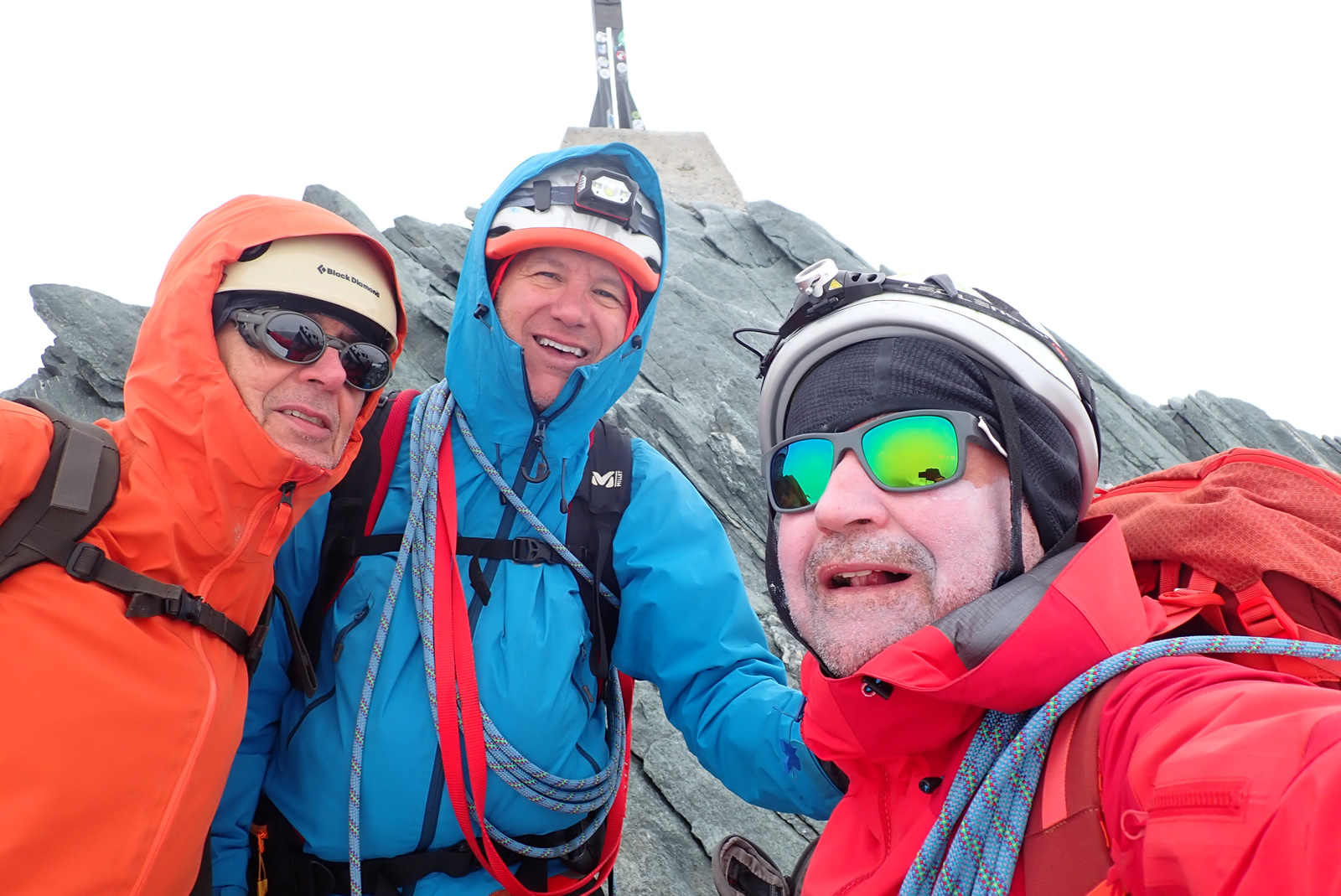 Antes vemos retirarse a los austriacos, una cordada de dos, resulta que el guía y mas mayor se ha hecho daño en la rodilla y no pueden seguir. Nosotros de todas formas íbamos muy lentos; las otras cordadas nos pasaban por todos lados. En un momento de la subida llego a decirles a mis compañeros “me aburro” con tono sarcástico casi irrespetuoso con mis compañeros. Y mas arriba Francesc para la cordada, está muy, muy cansado, algunos pasos fáciles le cuesta una vida, y cada paso es una parada; llega un momento que se vuelve, me mira con cara de estar machacado y moribundo y me dice “Terri, estoy muy cansado”. Yo hice una “joaquinada”, igual que lo del “siete pasos”; no le respondo, me pienso tanto que decirle que decido no decirle nada. Pasan unos segundos largos mientras Francesc me mira y no tengo piedad de él. Quiero cuidar de mi amigo, como él haría conmigo, y si no puede subir, pues habría que darnos la vuelta, pero por otro lado la vuelta puede ser mas larga que lo que nos queda de subida, y bajad hasta el Metro, y por otro lado yo me veo con ganas, con energía y valentía para llegar a esta cima, aunque tardemos todo el día. Con lo que al final al ver que no había respuesta, Francesc volvió a girar la cabeza y siguió el camino hacia la cima con su paso lento y muy cansado; detrás en el centro de la cordada, Jordi, y yo el último… solo pensaba: si Francesc, con lo cansado que está, resbala, Jordi no sabrá pararlo, lo arrastrará, y con la fuerza de caída de los dos, me arrastrarán mi también…