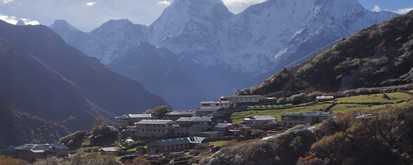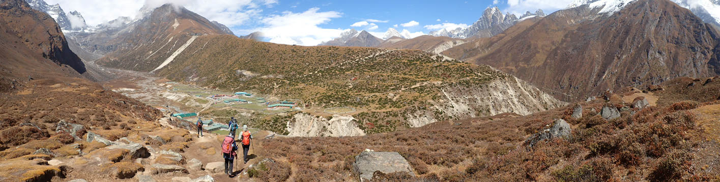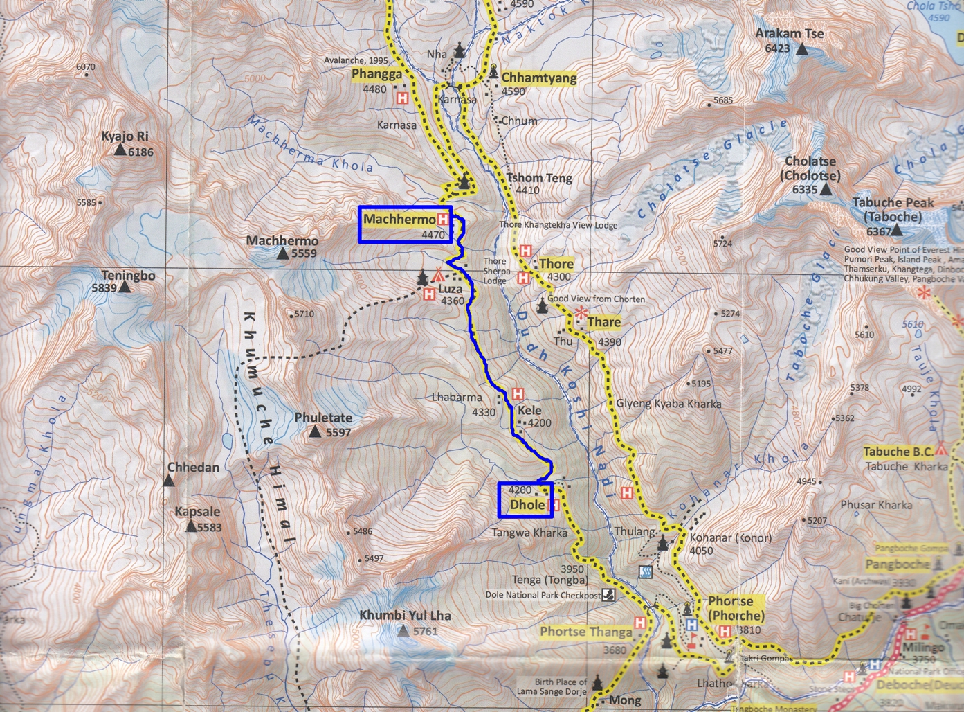 Camino de Machhermo atrás quedan, en el centro izquierda el Kantega (6.783 mts.) y en el centro derecha el Thamserku (6.618 mts.), bajo éstos Phortse, y el camino recorrido entre Dhole y Machhermo