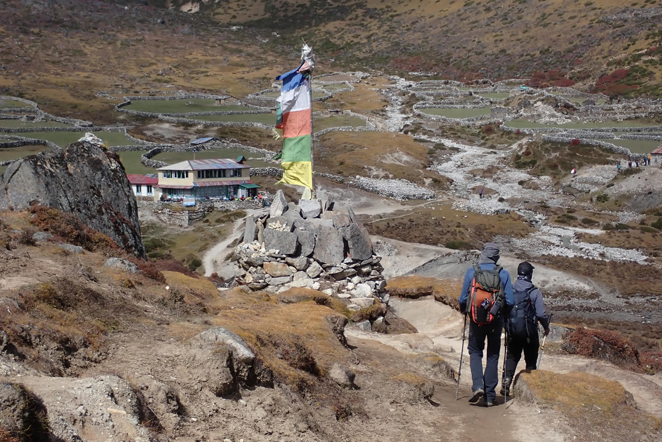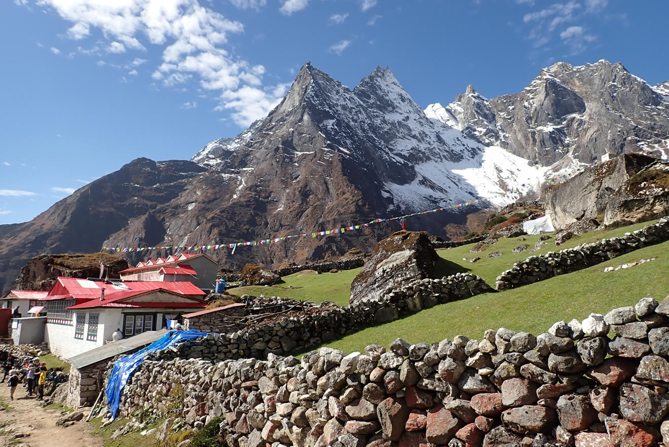 Pasamos por algunos grupos de casas con muros de piedra y suelo de verde hierba, muy bonito, es Luza (4.320 mts.) cerca ya de Machhermo. Antes hemos pasado por Kele, Lhabarma. El paisaje y vistas hacia la montaña bajo Kele es espectacular, es la cresta o cordal de Khumuche Himal, muy alpino y agreste, como ya he nombrado.