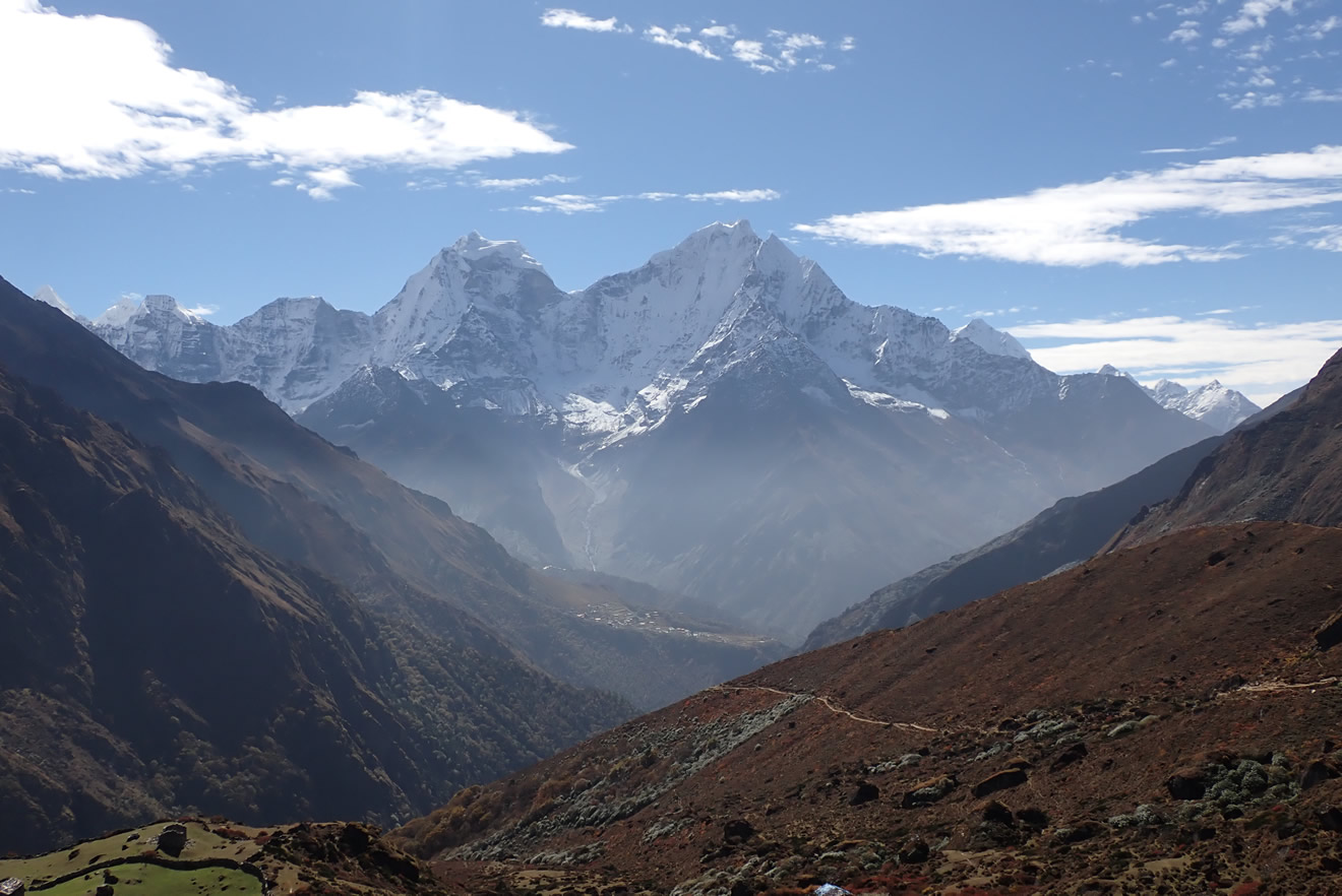 Delante Dhole, 4.020 mts., al fondo a la izquierda el Kantega (6.783 mts.) y a la derecha el Thamserku (6.618 mts.)