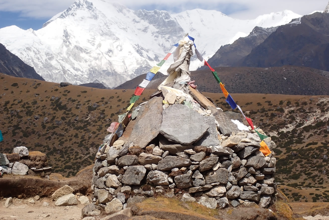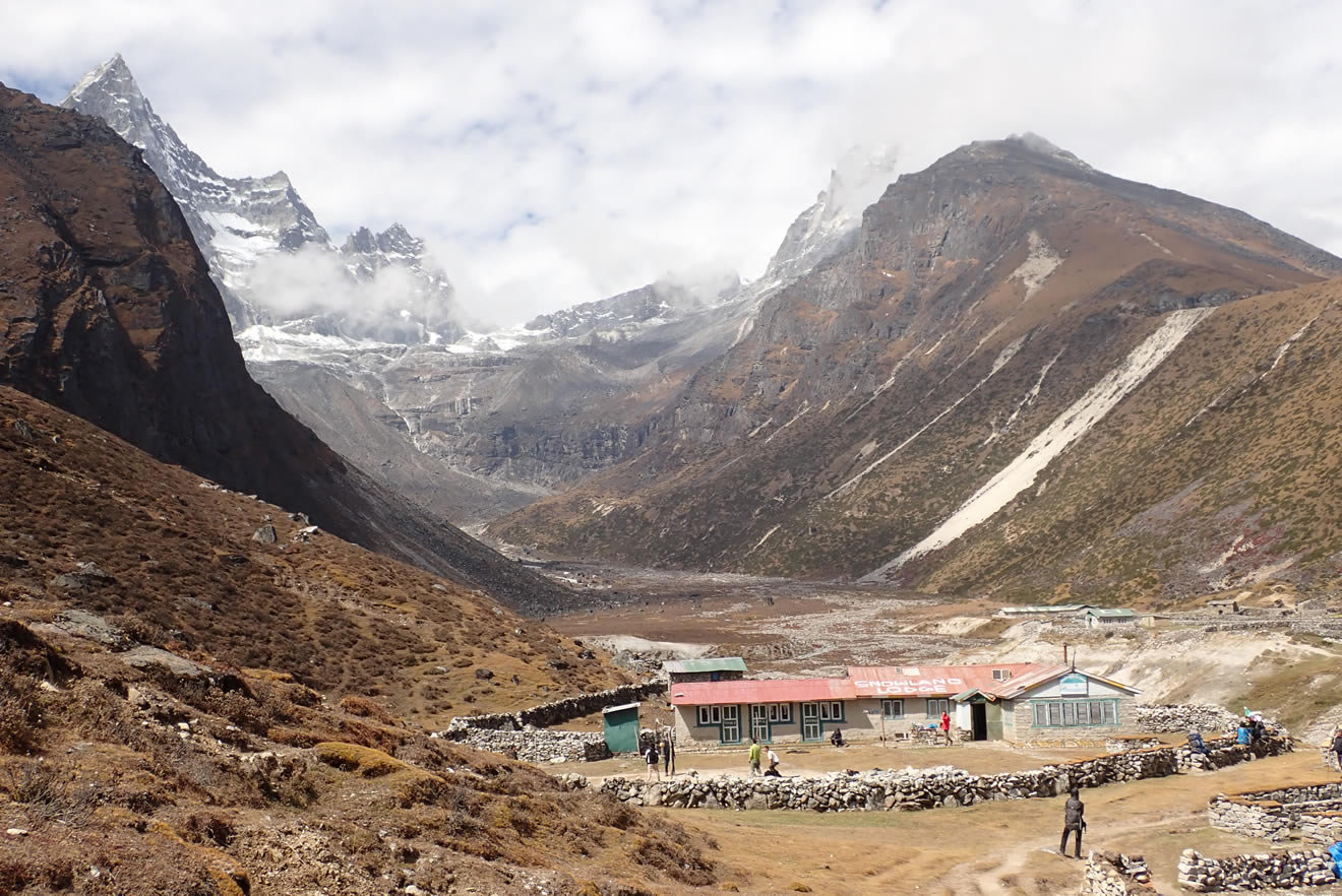 Machhermo, 4.390 mts., con la parte norte de Khumuche Imal detrás, Kyajo Ri (6.186 mts.) a la izquierda, y el Phari Lapche (6.017 mts.) a la derecha cubierto.