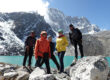 La ruta, como ya he indicado, sigue todo lo largo del valle del rio Dudh Koshi Nadi, hasta, que más arriba es el mismo valle del Glaciar Ngozumba, con sendas cordilleras o cadenas montañosas a cada lado con pasos de más de cinco mil metros y picos de más de seis mil metros. Impresionante. Es un valle ancho y profundo, ya que el agua del rio, como es característico, ha erosionado y profundizado el fondo; pero más llano o plano, cuando tiene el nombrado glaciar encima, glaciar que nace, como ya he descrito, en las extensas y heladas pendientes sur del alto y amplio Cho Oyu, y los siente miles que los rodea, formando un formidable circo impresionante, el inicio del valle. A la derecha, según avanzamos por el valle, quedarán dos formidables picos como el Tabuche y el Cholatse, y a la izquierda la cresta del Khumuche Himal, con algunos otros seis miles que se irán nombrando a la medida que los vamos descubriendo mientras ascendemos por el valle. Y en frente, al fondo del valle, el nombrado Cho Oyu, que se irá descubriendo y viendo cada vez más cerca, más altivo, más enorme, a medida que subimos por el valle… hasta llegar a Gokyo. Es un paisaje, y un lugar que te empequeñece, te sientes diminuto, ante tanta majestuosidad, inmensidad, es el verdadero Rey del Mundo.
