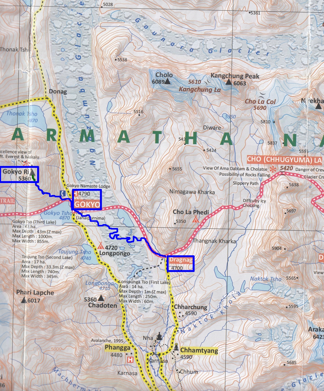 Llegamos de nuevo al Lodge de Gokyo. Es media mañana; aún tenemos que comer y recoger la ropa que intenta secarse al sol, rehacer la mochila y salir en busca de Dragnag, que es otro sitio o poblado, más pequeño que Gokyo, al otro lado del Glaciar Ngozumba. En línea recta están muy cerca uno de otro, parecería que fuera un corto recorrido, si no fuera porque hay que cruzar el extenso, laberíntico y extraordinario Glaciar Ngozumba, de una orilla a la otra: Gokyo está en la orilla oeste, donde se ubican los lagos de Gokyo, pero Dragnag, que es la puerta de ascenso al Chola Pass, se encuentra en la orilla este. Aquí ya no subimos más latitud (que no altura) para girar hacia el este, en busca de otro valle, de otro glaciar… el del Khumbu, el famoso Glaciar Khumbu, el que nace en las faldas del Everest y Lhotse…
