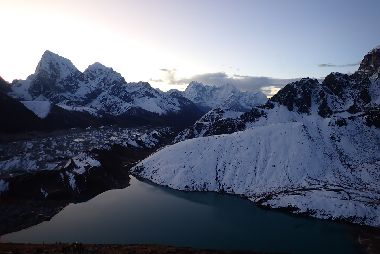 Panorámica amaneciendo subiendo a Gokyo Ri (5.357 mts.), abajo el lago Gokyo Tso, con Gokyo (4.790 mts.) en su orilla; sobre éste el Glaciar Ngozumba, a la derecha las laderas del Phari Lapche (6.017 mts.), al fondo en el centro derecha, los más altos el Thamserku (6.618 mts.) el de la derecha, y el Kangtega (6.783 mts.) el de la izquierda. En el centro de derecha a izquierda: el Tabuche (6.495 mts.), el Cholatse (6.440 mts.), posiblemente el Arakan Tse. Al fondo en el centro izquierda se asoman las cimas del Everest (8.848 mts.), la de la izquierda, y la del Lhotse (8.515 mts.) el de la derecha, con la larga cresta al Nuptse. A la izquierda el Chola (6.097 mts.)