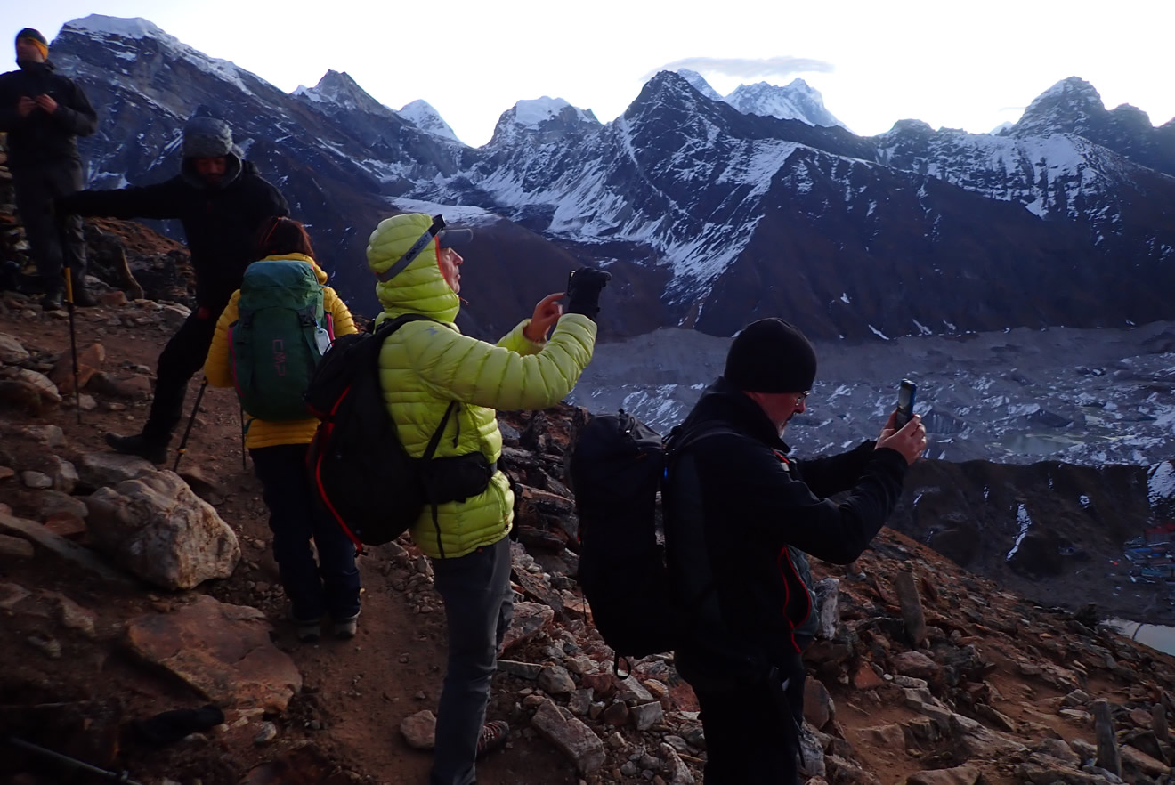 No hemos llegado a la cima, pero llegados a un punto ya paramos para admirar el paisaje y amanecer. Por suerte amanece con muy pocas o ninguna nube, algunas para hacer bonito. Y comenzamos a maravillarnos con el paisaje: abajo aparece el enorme lago de Gokyo Tsho, al fondo reconocemos al Thamserku y Kantega, tan altivos y espectaculares como siempre a pesar de la lejanía, de la distancia, se nota que son montañas con renombre, faros de este pueblo Sherpa, soberbios, grandiosos. Mas cerca reconocemos los dos picos hermanos que parece se quedaran en el centro de este trekking que estamos haciendo, el Tabuche y Cholatse, también cortados, desafiantes, temibles y a la vez exageradamente preciosos. Abajo aparece el recorrido y la blancor del Glaciar Ngozumba, blancor que no veíamos ayer, la nieve invade su laberinto de laderitas y montículos, montículos que son las arrugas del hielo del glaciar, formados por el mismo transcurrir por su valle. Hermoso. Y si giramos la cabeza un poco más al este, vemos al fondo, detrás de las montañas que tenemos delante y pegadas a las de delante, dos altas puntas que comienzan a sobresalir, que nos da a entender que deben de ser altas y grandes montañas del Himalaya… y así es, son las cimas del Lhotse y Everest, que poco a poco comienzan a destacar en el horizonte himaláyico. Espléndido, maravilloso, único.