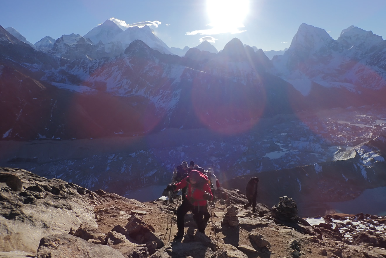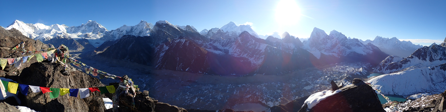 Llegando a la cima de Gokyo Ri (5.357 mts.), detrás queda el Glaciar Ngozumba, abajo derecha parte del lago Gokyo Tso, y arriba de derecha a izquierda, las puntas del horizonte…: Tabuche (6.495 mts.), Cholatse (6.440 mts.), posiblemente el Arakan Tse, Makalu (8.485 mts.) (estos dos debajo del sol), el Lhotse (8.515 mts.) con la larga cresta al Nuptse (7.864 mts.), Everest (8.848 mts.), Khumbutse (6.639 mts.) y el Pumo Ri (7.165 mts.) medio escondido