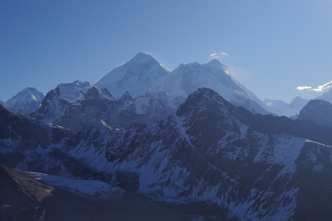 Por suerte el día es increíble. Comienzan a aparecer las nubes del amanecer en el horizonte por la zona del Thamserku y Kantega, que poco a poco se irán extendiendo; son nubes altas, delgadas. Y por suerte del tiempo, podemos admirar y asombrarnos con las vistas, detrás ya de montañas altas de cinco y seis mil metros, los enormes y altos Everest y Lhotse. Han ido apareciendo como gigantes ocultos, escondidos en el rocoso y alpino horizonte, a medida que íbamos ascendiendo y la altura nos dejaba ver estas enormes y sobresalientes moles. El Lhotse ya lo habíamos visto en el camino a Dhole, pero no se veía el Everest; pero ahora ya podíamos ver el Everest… ¡El Everest! Esa montaña tan codiciada por el mundo montañero como turístico, la montaña más alta del mundo, del planeta tierra, y allá la descubrimos, inconfundible, con su perfil con forma de pirámide inclinada con sus diferentes líneas, estratos, pero sin un perfil agresivo, descarado, más bien afable pero gigante, desmesurado, como diciendo “no tiene un perfil difícil pero enorme, largo” y esa es su dificultad, su altura y su largo, largo recorrido hasta su cima… antes de que la típica nube de viento se pose en su cima y nos tape las vistas de su ansiada cima, le hacemos fotos y videos.