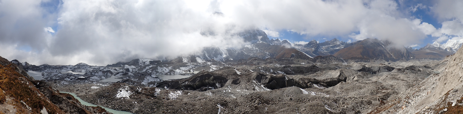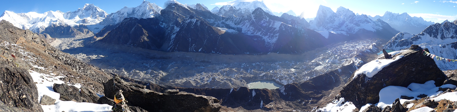 Panorámica desde la cima de Gokyo Ri, 5.357 mts., abajo queda el Glaciar Ngozumba, desde su nacimiento en las faldas del CHo Oyu a la izquierda, hasta su final a la derecha