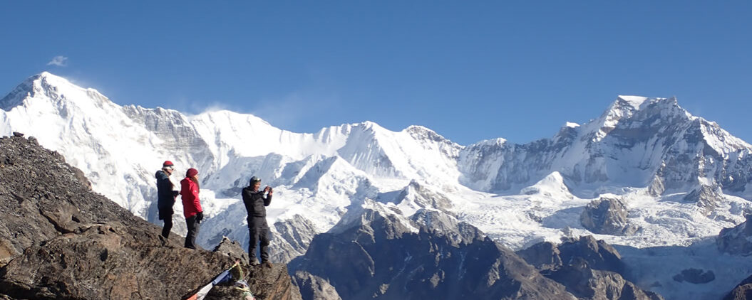 Fotos con el fondo del Cho Oyu. No quepo en mi asombro y alegría. Subimos rocas de la cima para encontrar el mejor encuadre; para allá y para acá… pero no podemos estar todo el día aquí admirando los ochomiles, glaciares y laberinto de picos puntiagudos salpicados de hielos, nieves y desafiantes verticalidades… y lo cierto es que desde aquí vemos cuatro ocho miles: el cercano Cho Oyu al norte, en frente al este el Everest y su hermano siamés, Lhotse, y detrás de éste a la derecha un poco más al fondo, aparece otra puntiaguda y gran pirámide, que por la distancia aparece más baja y pequeña, pero desafiante y atrayente: es el Makalu. Cuatro de los catorce ochomiles del planeta, de entre ellos el más alto del Mundo, tenemos de un solo vistazo. Impresionante, magnífico.