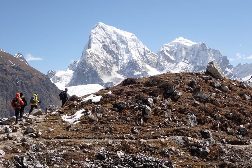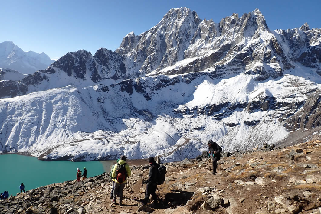 Luis, Jordi, Dolors y Prem bajando de Gokyo Ri, abajo el lago Gokyo Tso. Arriba el Phari Lapche (6.017 mts.), al fondo parte del Thamserku (6.618 mts.)