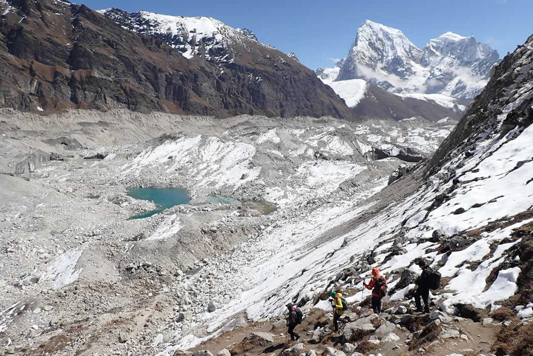 Bajando al Glaciar Ngozumba, al fondo a la izquierda, el Cholatse (6.440 mts.) y el Tabuche (6.495 mts.) a la derecha