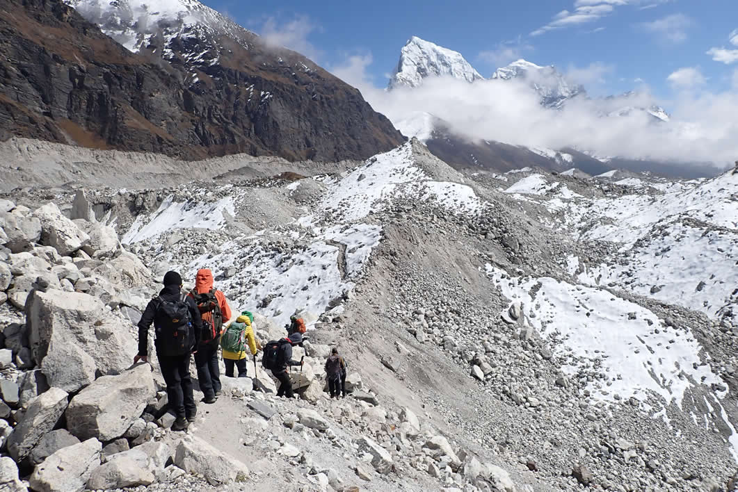 Cruzando la morrena en busca del Glaciar Ngozumba, arriba a la izquierda, el Cholatse (6.440 mts.) y el Tabuche (6.495 mts.) a la derecha