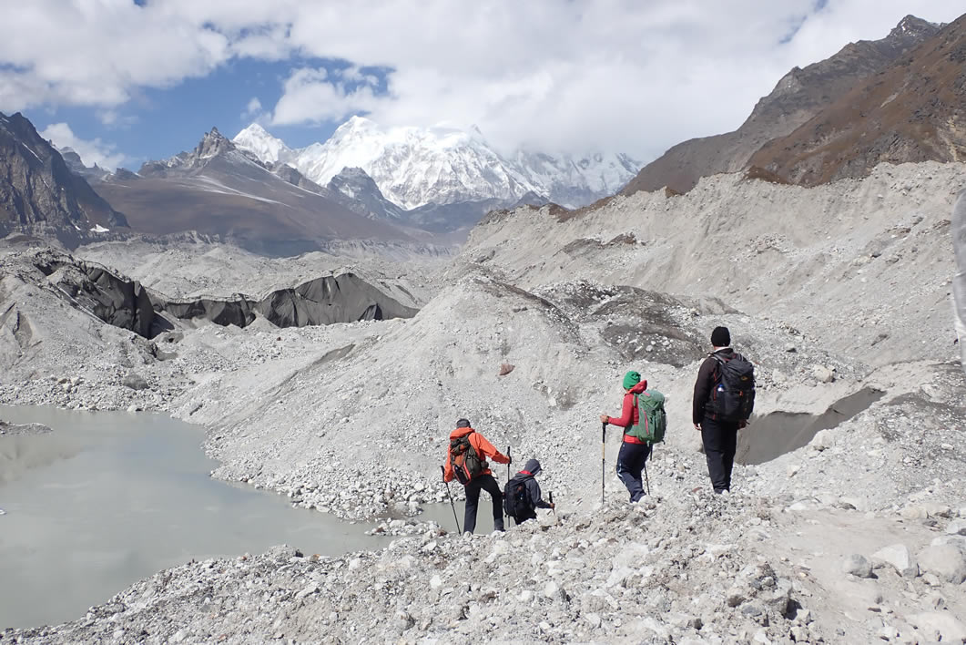 Salimos de Gokyo por otra senda hacia el sur, casi paralela a la que llegamos ayer, pero que se dirige a las suaves laderas de la morrena del glaciar. Subimos a ella, y cruzamos al otro lado para colarnos en el mismo laberintico, ondulado y curiosamente formado, Glaciar Ngozumba. Al fondo las magníficas vistas del Tabuche y Cholatse, con esos impresionantes perfiles verticales de acanaladuras heladas, de glaciares colgantes ubicados casi milagrosamente en las paredes de las puntiagudas y gigantescas montañas, hipnotizante, impresionantes.