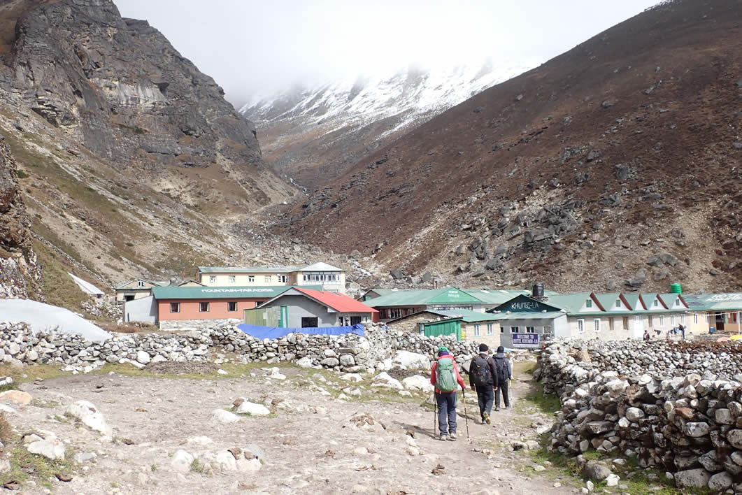 El lugar es más frio y triste, pero parece que no hay tanta gente como en Gokyo. El bar o comedor del Lodge está más vacío. Nos hospedamos en las habitaciones más frías y húmedas que en Gokyo. Hay un lavabo entre el pasillo donde están las habitaciones y el comedor. También te puedes duchar.