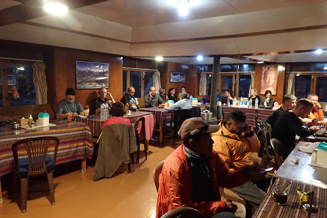 Lodge en Dragnag, 4.700 mts., en la mesa de la izquierda Luis (con gorro), Jordi y Dolors (de espaladas), la mesa del fondo las argentinas/uruguayas, y la mesa de los porteadores delante a la derecha
