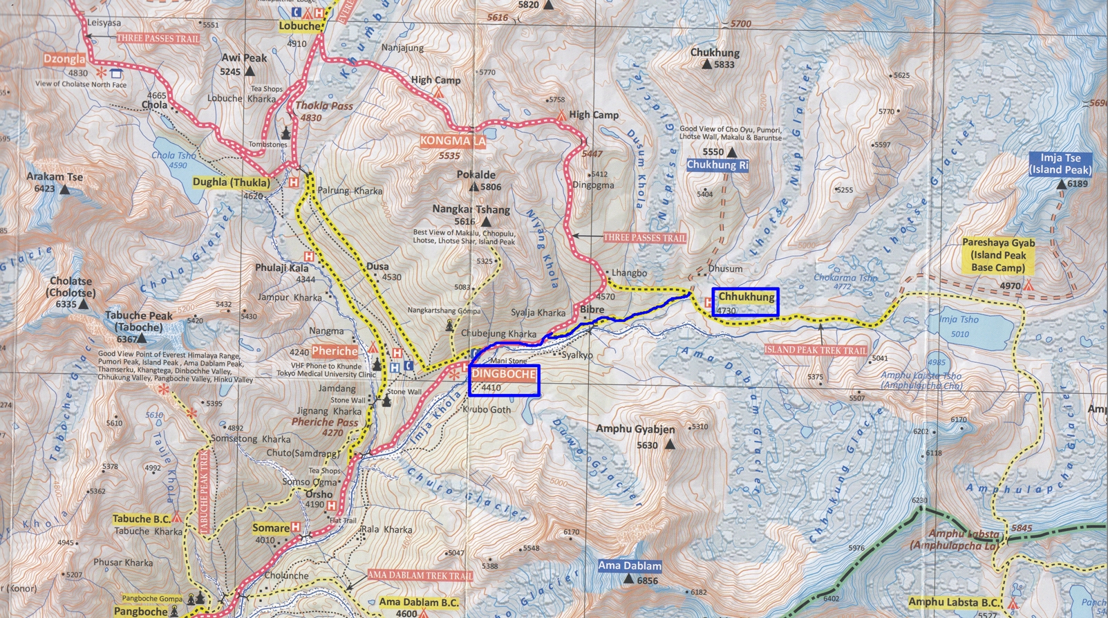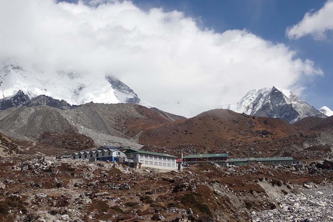 A partir de ahora, la idea es dejar los recorridos habituales de los trekking que te acerca o pasan por el valle del Khumbu, Campo Base del Everest, y desviarnos de dichos recorridos hacia la base del Island Peak (Imja Tse), el cual será nuestro próximo y último gran objetivo; por el valle del rio del mismo nombre en busca de su nacimiento, más o menos, pero parando antes en una población con lodges, en Chhukhung, donde haremos noche. A partir de ahora, el paisaje de la alta montaña del Himalaya cambiará, descubriendo nuevas montañas, alturas y paisajes helados, alrededor del mismo Island Peak y alrededores. Sobre todo admiraremos, ya que pasaremos bajo ella, la gigantesca cara sur, o pared sur, del Lhotse, con toda la cresta del Nuptse, con la que tendremos, aproximadamente un desnivel de más de 3.500 metros desde nuestros pies en este paseo, hasta la cima del mismo. Impresionante.