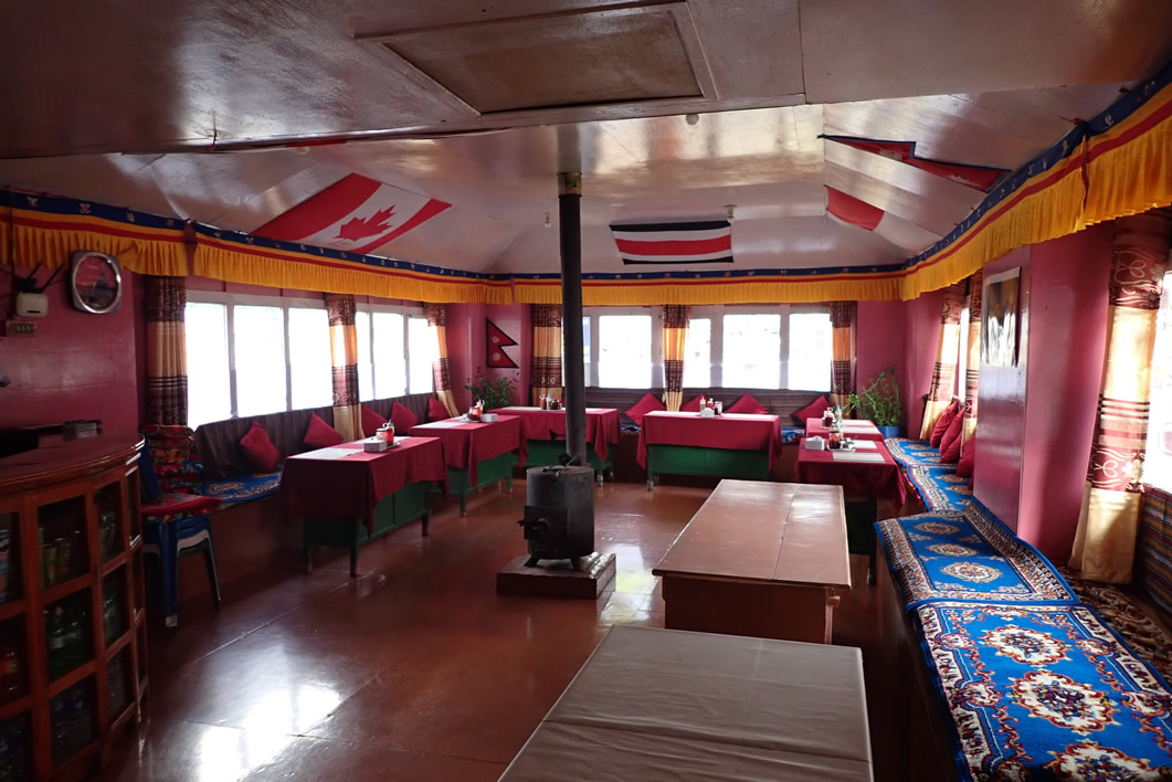 Como la etapa de hoy no era muy larga y más bien de descanso, no madrugamos mucho, con lo que, comparado con otras etapas, hoy será un paseo. Nos da tiempo a desayunar en el solitario comedor del Lodge de Dingboche, el cual me parece que solo hay uno o dos grupos más de poca gente, aparte de nosotros. Aunque en el desayuno casi que estamos solos. El comedor, como en casi todos los lodges, tiene las mesas alrededor de la estancia, y un banco que recorre todas las paredes junto a ellas, así se ahorran sillas; la barra en un extremo, en la que pedimos el wifi para poder comunicarnos con nuestros familiares y redes sociales, y una estufa de hierro cilíndrica de leña en el centro de la misma.