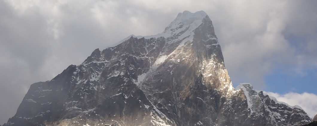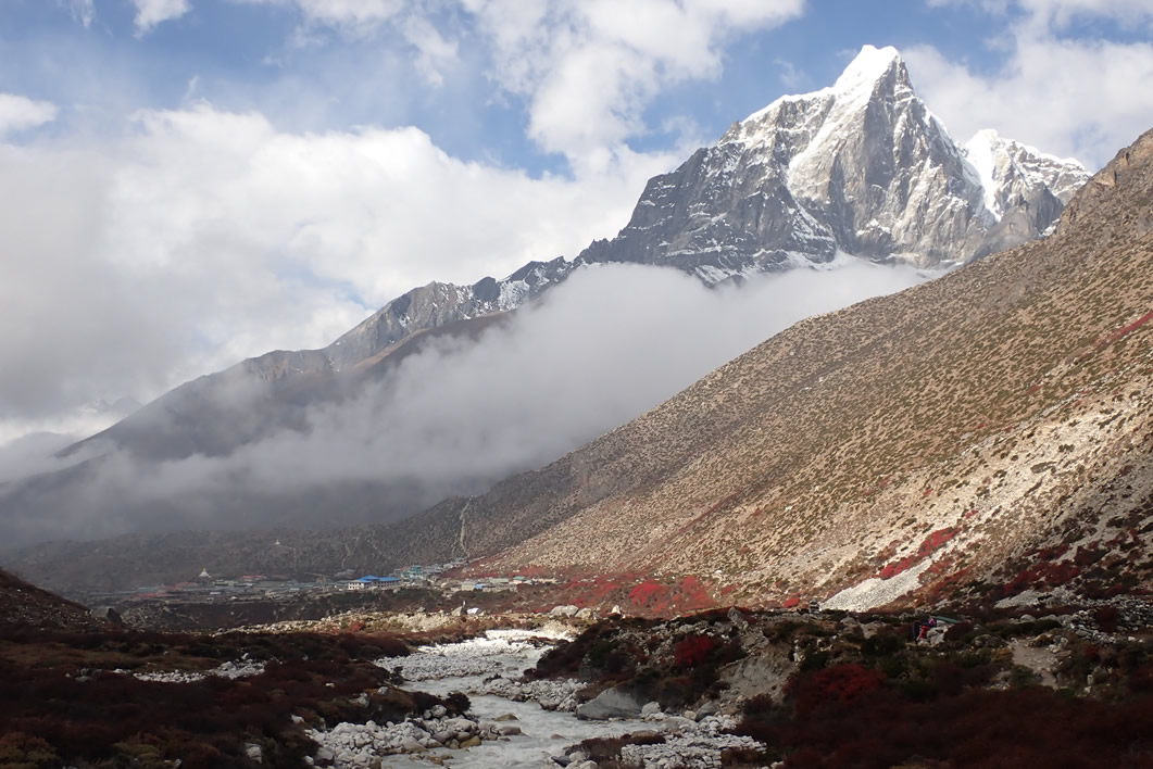 Pero giramos nuestra vista hacia la dirección a la que nos dirigimos, valle arriba del Imja Khola, y en medio del hueco del valle, aparece una montaña como solitaria, separada del resto pero fácilmente reconocible: es el Island Peak o Imja Tse. Su localización y característica dan fe de su nombre: “el pico isla”; ya que aparece como separado por cresta, cordal u otra montaña que la una al resto del Himalaya. Realmente eso no es así, y está unida a la loma de más de siete mil metros de altura que baja desde la misma cima del Lhotse hacia el este, sureste, pero dicho cordal estaba justo detrás de la montaña y no se apreciaba, no se veía, por ello parecía una isla solitaria entre tanta montaña. Se veía algo escarpada, con una cresta cimera interesante y desafiante, pero no veíamos el lado por el que se ascendía. Con espolones, crestas y vertientes verticales; una ladera vertical oscura por la roca sin nieve con forma de pirámide, muy característica de esta montaña. Detrás del Island Peak se veían más montañas, crestas, cordales helados a más de seis mil metros, los cuales, a medida que nos íbamos acercando, podríamos admirar y descubrir. Es otro paisaje del Himalaya, otro rincón de gigantes, que iremos observando a medida que nos acercamos al objetivo de la etapa del día, Chhukhung. Si las nubes y las nieblas nos dejan…