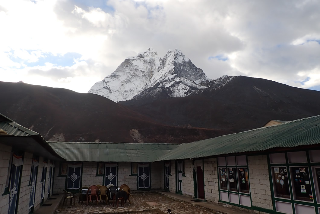 Salimos al exterior para comenzar la marcha ya en pleno día, y las nubes no han marchado del todo o han vuelto a cubrir o rasgar las montañas y el cielo. No está cubierto del todo, de forma que nos permite admirar las montañas de alrededor de Dingboche. Una de ellas, ya descubierta ayer por la noche entre la oscuridad, es el fenomenal Ama Dablam, la otra, que la descubrimos hoy y que queda más al oeste, poco más alejada, es el Tabuche; que desde este punto tiene una forma menos helada pero más roca vertical y escarpada. Parece otra montaña. Impresionante. Sus paredes y crestas parecen hechas para no ser pisadas, para no ser conquistadas, es asombrosa y espectacular. Una montaña imposible. Preciosa y muy escarpada por este lado (… y casi por cualquier lado) … lo curioso es que, en el trekking que hacemos, le damos la vuelta a esta montaña (y al Cholatse) y las veremos por todas sus vertientes. Fabuloso. Por arriba de los tejados también descubrimos dos gigantes más que son el Thamserku y el Kantega, con sus vertientes heladas, verticales, muy, muy altas, agrestes, puntiagudas, muy, muy alpinas… ¡Vaya montañas! Ni adrede se crea una montaña, un paisaje como éste, la Naturaleza es increíble, y el Himalaya es un lugar único, no me canso de mirar y admirar estos titanes.