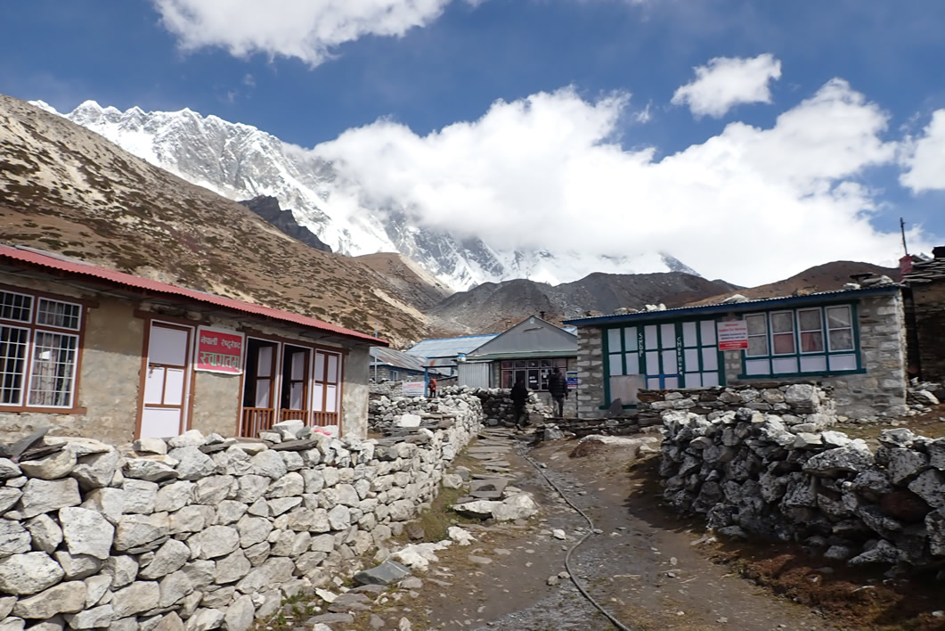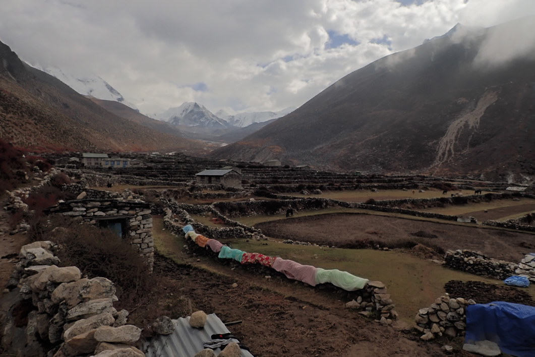 Las nubes no han desaparecido y siguen escondiendo y dejando ver a la vez, según vienen o se van, las cimas y montañas que rodean este ancho valle del Imja Khola, cuando llegamos a la localidad de Chhukhung (4.730 mts.). De nuevo subimos altura. Estamos 100 metros por debajo de la cima del Mont Blanc, de nuevo. Chhukhung es un pueblecito en el que han construido grandes y modernos Lodges, entre las antiguas y casi ruinosas casas originales, separadas en parcelas con esos muritos de piedra, como en Dingboche; pero no es tan grande como Dingboche.