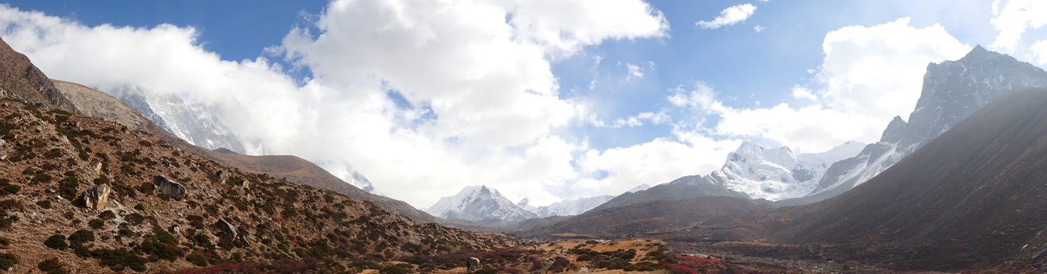 Panorámica camino de Chhukhung; a la izquierda la nublada cara sur del Lhotse (8.516 mts.), en el centro el Island Peak (6.189 mts.), en el centro derecha las montañas y circo de Amphu Labsta, y a la derecha el Amphu Gyabjen (5.630 mts.)