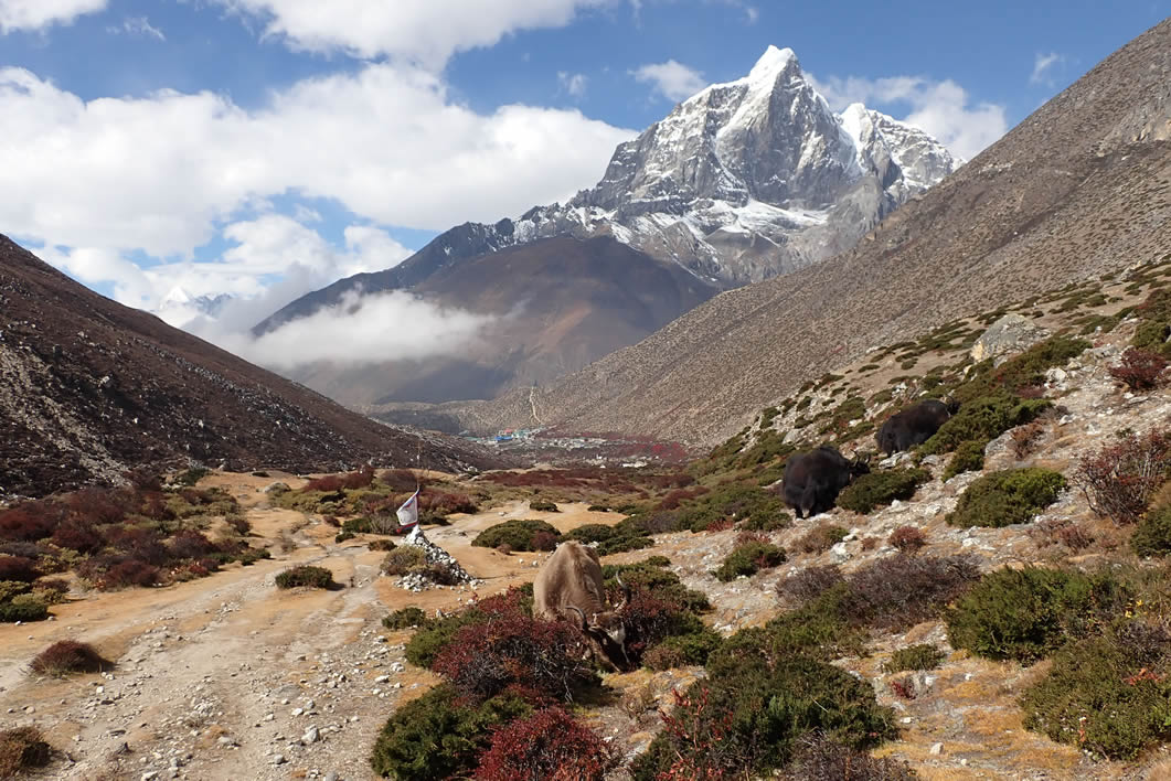 Camino de CHhukhung nos encontramos un grupo de Yaks, al fondo queda Dingboche y arriba el Tabuche (6.495 mts.)
