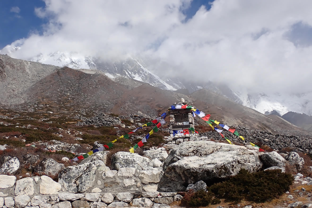 Más adelante nos encontramos con otro memorial, otra construcción en forma de túmulo, ancho pilar cortado, con tejadito, placas con inscripciones y varias banderitas budistas de colores con sus oraciones; algo parecido a los encontrados en la bajada a Dughla, pero uno solo. Es el memorial al polaco Jerzy Kukuczka. El himalayista y conquistador de ocho miles, que compitió con Reinhold Messner en ser primer alpinista del Mundo en subir los catorce ochomiles, entre otros desafíos. Justo detrás de éste, mirando hacia el norte, hacia la montaña que quedaba a la izquierda cerrando el valle en el que nos encontramos, se encuentra la pared en la que se precipitó y murió: la cara sur del Lhotse, junto con la larga y alta cresta del Nuptse, ahora nubladas, casi invisibles a nuestros ojos. Luis lee la placa la inscripción y aprecia la palabra “héroe”, exclama que uno que muere en la montaña no es un héroe, si no un inconsciente, un temerario, casi un estúpido… yo no le replico, no le digo nada, pero me parece que esta gente que moría en aquellas circunstancias, en aquella época y en aquellas montañas, quizás no se le podría decir héroes, pero sí eran gente extraordinaria, gente especial que desafiaban en cada momento a la muerte, y hacían cosas que nadie podía hacer… pero enfrentarse a la muerte a veces tiene su precio, un descuido, un accidente, un temporal… y te quita la vida.