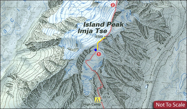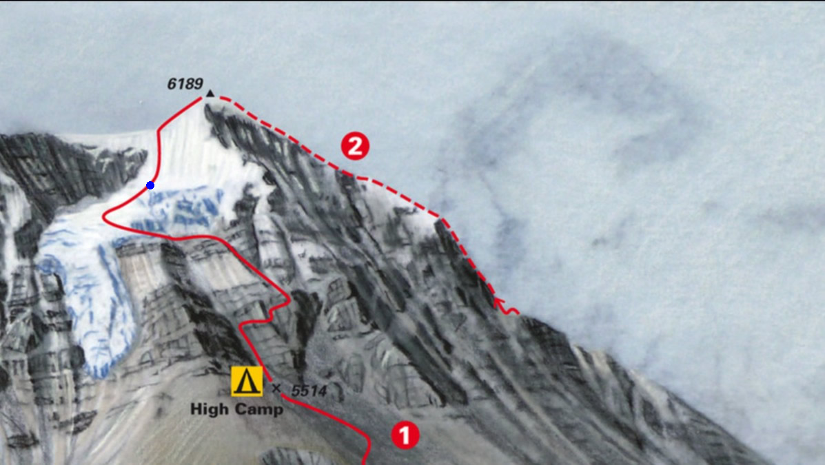 Croquis de Island Peak o Imja Tse. Recorrido del ascenso realizado: línea roja (1). Punto Azul: lugar aproximado donde nos quedamos a 6.000 mts. aprox. High Camp a 5.600 mts.