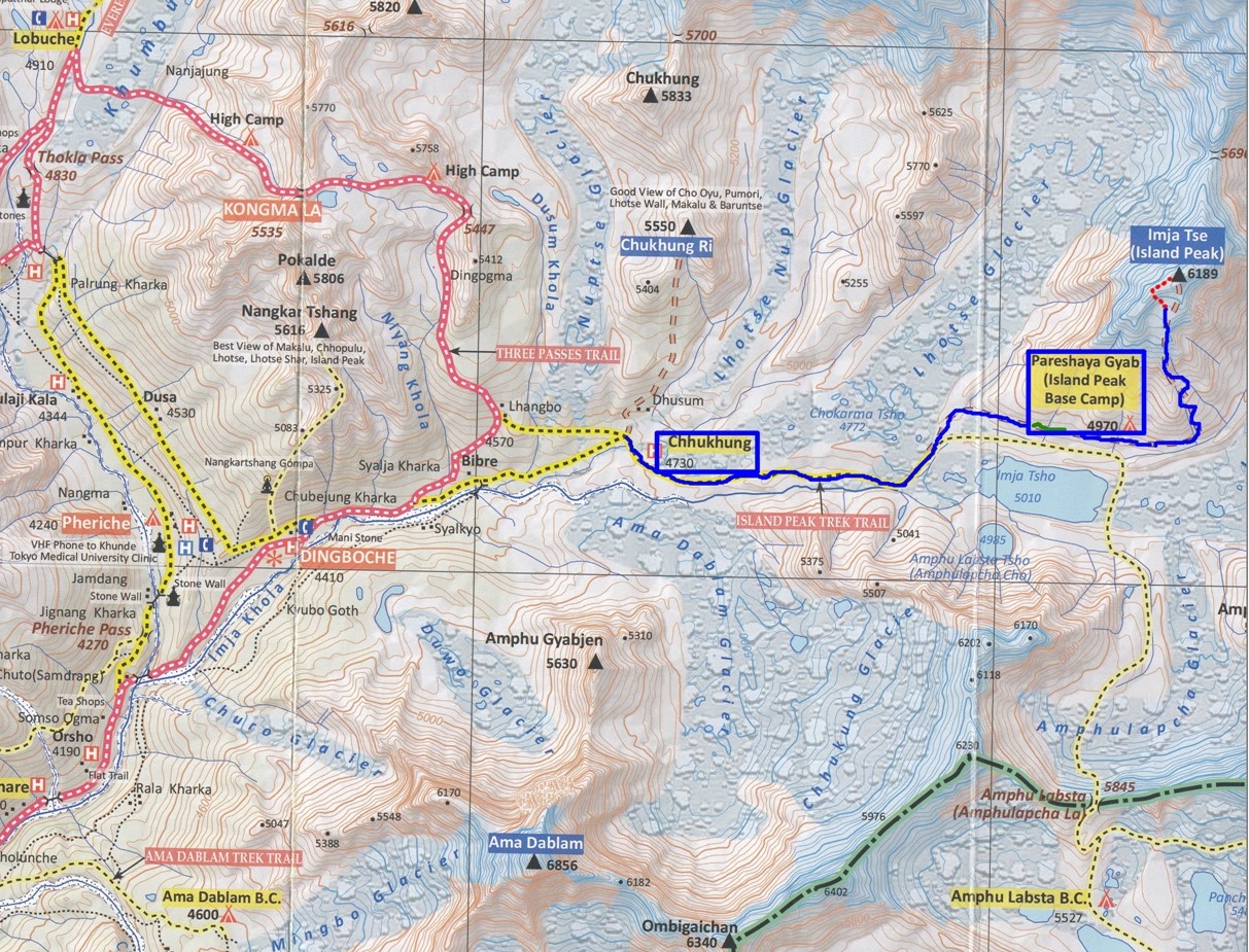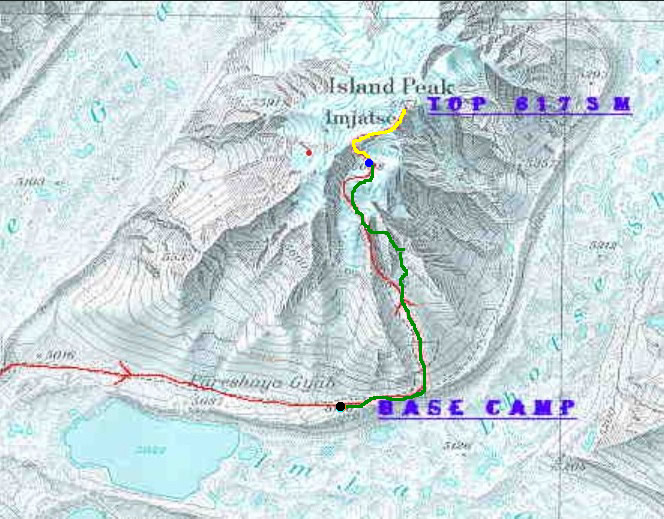 Croquis de Island Peak o Imja Tse. Recorrido del ascenso realizado desde el Campo Base: línea verde. Punto Negro: Campo Base, 5.080 mts. Punto Azul: lugar aproximado donde nos quedamos, 6.000 mts. aprox. Línea Amarilla: recorrido que nos quedaba hasta la cima.