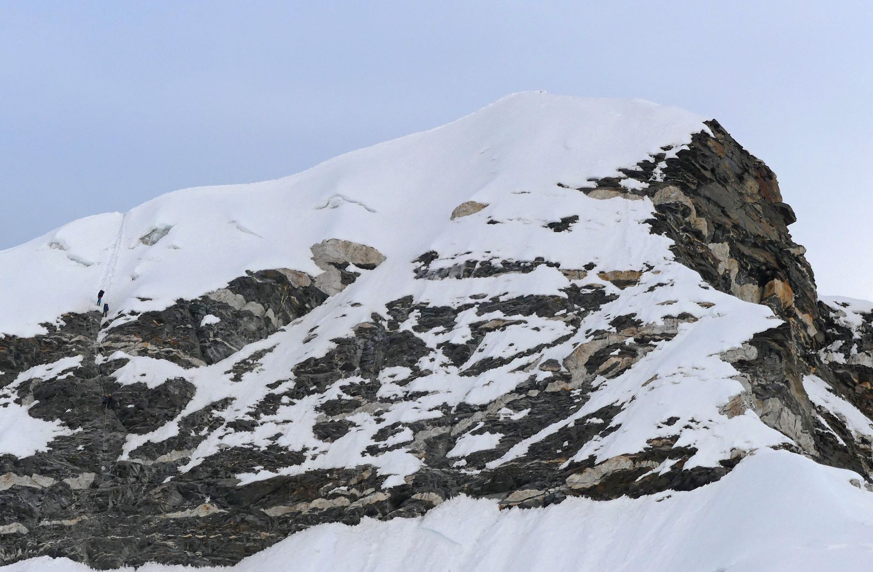 Y mientras caminamos por el ahora fácil glaciar, que en un principio es llano, un falso llano, pero comienza a empinarse y girar el recorrido a medida que vamos acercándonos a la parte más alta o a la barrera rocosa que hay bajo la cresta cimera a la izquierda del glaciar, observamos las cuerdas fijas por en medio de la nombrada barrera rocosa que no llega a ser pared muy vertical. Éstas cuerdas fijas van desde el final del glaciar, desde su rimaya, hasta la cima de la cresta cimera… parece que hay muchas cuerdas fijas.