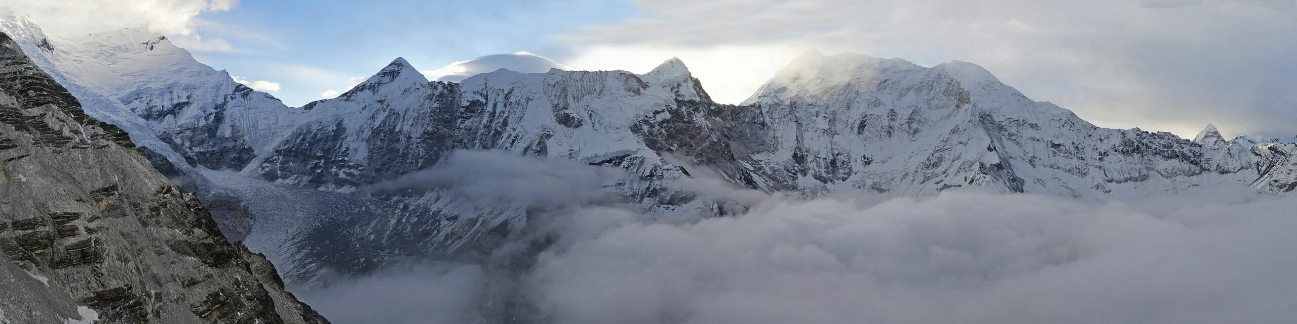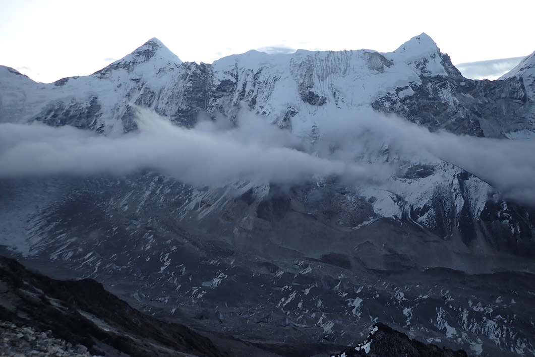 Debajo de este muro aparecen los glaciares que bajan de éstos, los cuales están medio tapados a causa de sus morrenas, de la tierra, piedras y barro que transportan y depositan a sus lados. En medio de estas morrenas e invisibles glaciares, aparece el gigantesco lago glaciar del Imja Tso, exagerado, enorme; y entre todos, neveros de blanca o terrosa, grisosa, nieve, glaciares helados, seracs o paredes lisas, escarpadas sin nieve. Las nubes no se han ido y aparecen entre las montañas y el valle, parece que nos quiere dar un toque romántico, románticamente helado, pero precioso.