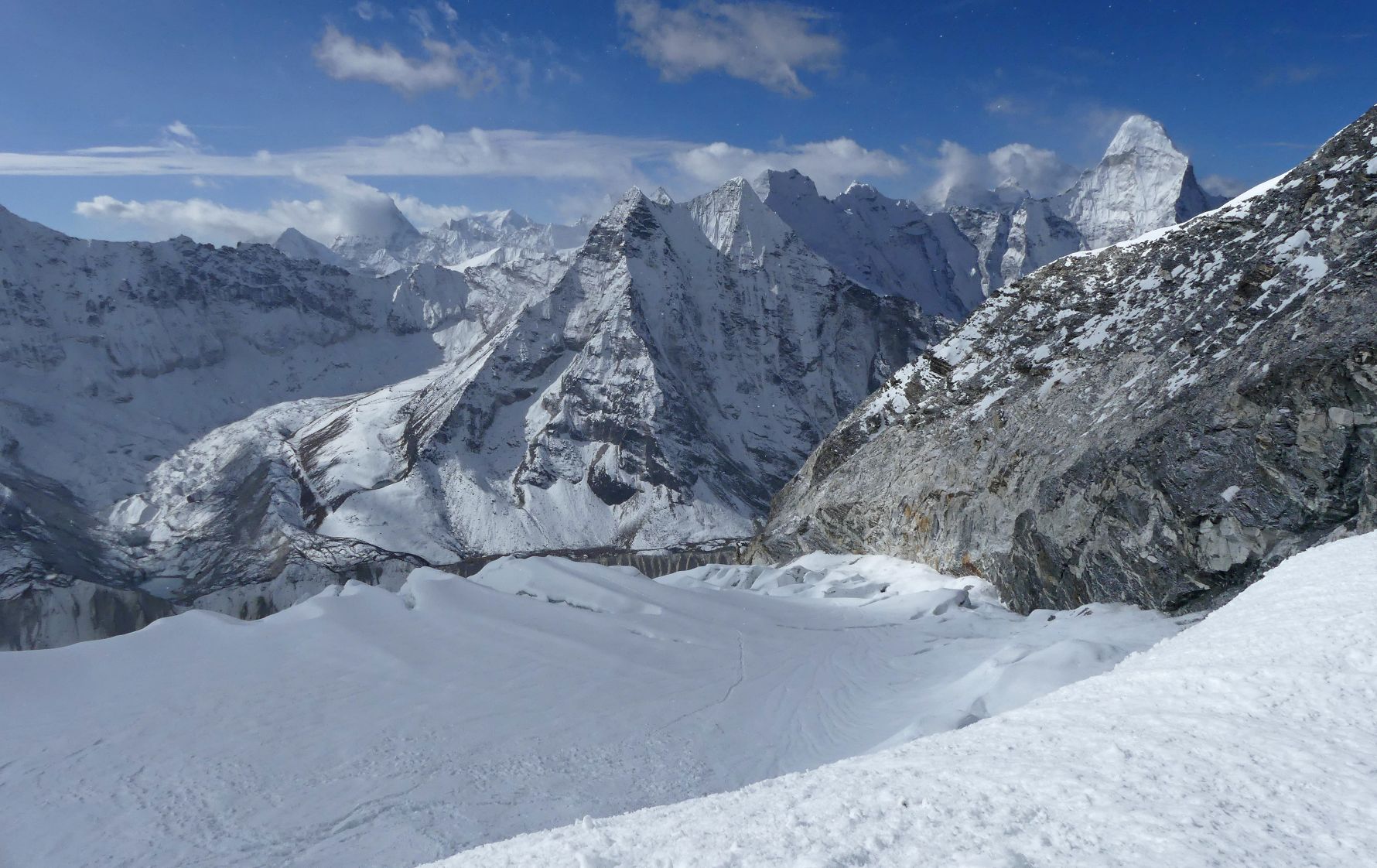 Abajo el recorrido por el plateau del glaciar en la subida al Island Peak o Imja Tse, el centro la zona del Amphu Labsta, con el Ombigaichan (6.340 mts,) el más alto, detrás a su izquierda el paso del mismo nombre, y a la derecha el Ama Dablam (6.814 mts.)