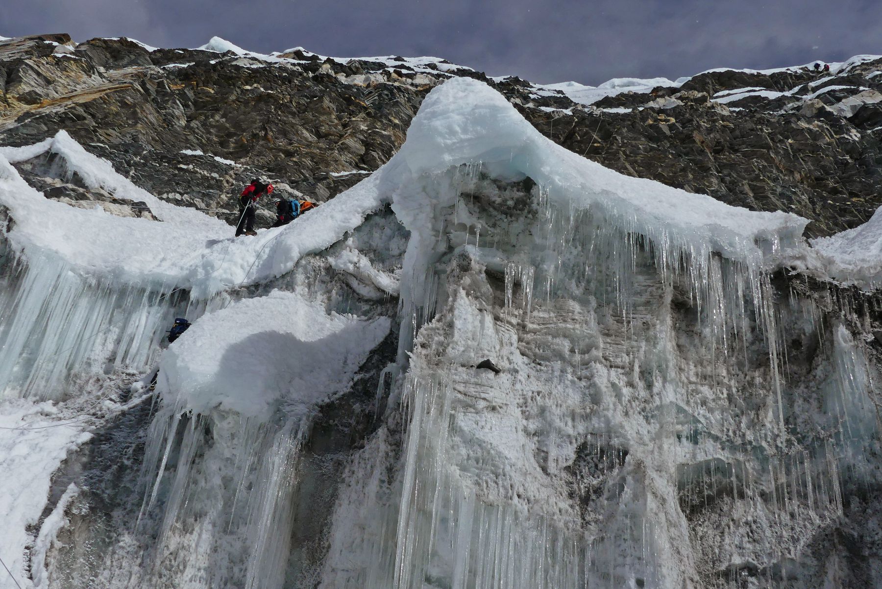 Al estar tan cansado en esta parte de la actividad, sigo sin hacer ni una foto, el cansancio mi impide inspirarme para hacer fotos, no tengo ganas, solo de salir de una vez de este infierno. Jordi hace pocas más, las aprovecharé para enseñarlas. Pero lo más curioso son los comentarios de Luis y Jordi más adelante: lo que han visto en YouTube no tiene nada que ver con lo que nos hemos encontrado. Según los videos del ascenso vistos en YouTube, la actividad no era tan esforzada, tan técnica, tan peliaguda, tan entretenida… ahora parecía que había tres o cuatro veces más cuerdas fijas que en los videos, con lo cual puede tener tres o cuatro veces más dificultad que en los videos. Hablando con Prem, nos dice que la montaña en estos tres últimos años ha cambiado sensiblemente, el glaciar se ha retirado, ha dejado más barreras rocosas, más grietas, más impedimentos y obstáculos que lo hacen más peligroso y temible… eso también les echan para atrás a los compañeros que han visto los videos. Por lo visto, los videos son de hace más de tres años, no son actuales, de ahí la perplejidad y sorpresa. Las montañas están cambiando a pasos agigantados, se vuelven más grises, peligrosas e inestables, es un hecho probado desde hace más de dos, tres décadas, y se está acelerando por momentos. Es una pena… son tan hermosas estas montañas con sus glaciares y blancura…
