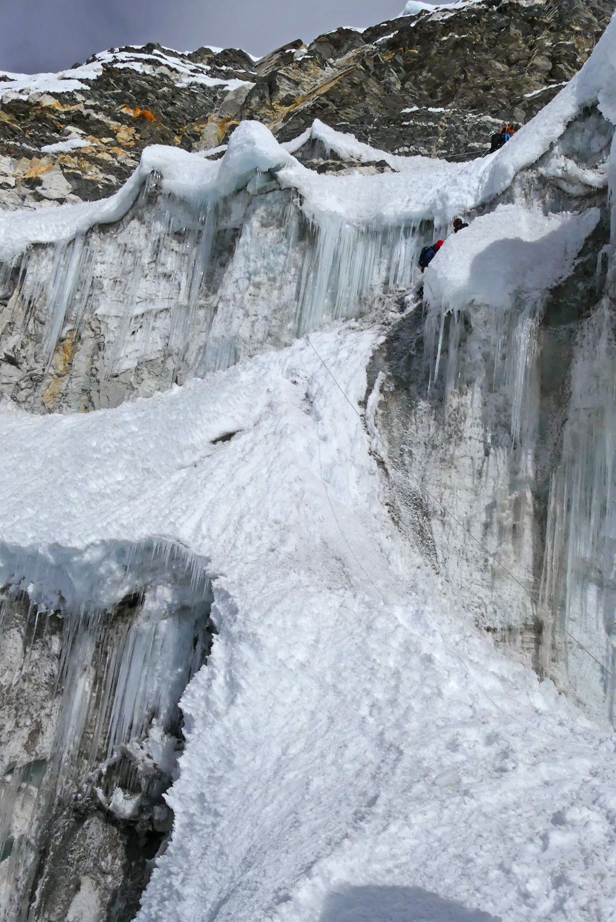 Voy muy lento y sin fuerzas pero consigo llegar a un punto desde el cual puedo observar, girando a la izquierda, una gran grieta que casi forma un serac, inclinado, desplomado, por el que bajan montañeros en un rappel volado, pero que tienen que hacer un péndulo para no acabar en el agujero de la grieta. Es espeluznante. Espero al resto del grupo a que llegue. Me siento en el hielo del glaciar mientras el sol intenta calentar, con el plumas North Face abierto por su calor y mirándome las botas G2 de La Sportiva, para comprobar que los crampones, en la parte de los talones, están bien clavados al hielo para no resbalarme y bajar el glaciar sin freno ni piolet. Y ahora al sentarme el cansancio y no sé si un mareo o dolor de cabeza, se agudiza, creo que no podré seguir más pero no digo nada a los compañeros que comienzan a llegar a mi punto. Luis se queja de las cuerdas fijas, que son muy viejas y están muy deterioradas. Sí que es verdad que estaban como cubiertas de hielo por lo que parecían deshilaches, no sé, el caso es que Luis se quejaba mucho del estado de las mismas y no se fiaba demasiado, estaba inquieto. Jordi y Dolors estaban bien, pero al ver el rappel volado, se estremecieron: “¿¡Por ahí hay que subir?!” No debería ser por ahí, ya que es por donde bajan los montañeros. De hecho nos quedamos viendo como algunos grupos, uno de ellos era el chico aquel de barbita, que ya baja en el rappel volado. Tranquilo, animado y con fuerzas. Curioso.