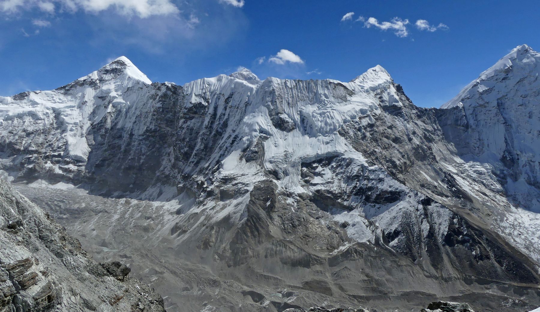 De izquierda a derecha: El Cho Polu (6.700 mts.), posiblemente el Makalu (8.485 mts.) detrás en el centro, el Numri (6.635 mts.) y el Kali Himal (6.985 mts.) a la derecha (detrás de éste la puntita del Baruntse, 7.129 mts.).