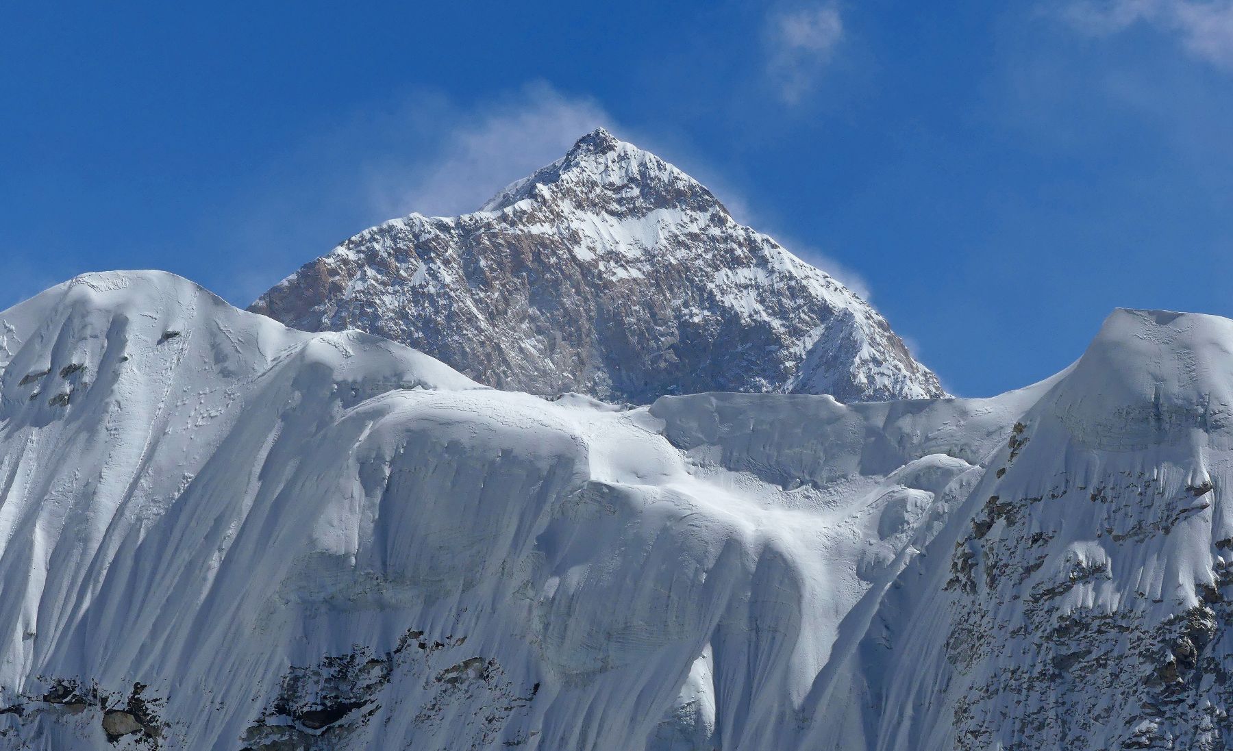 Y por fin llegamos arriba de la pala saliendo de la grieta al magnífico y fácil plateau. Luis ayuda a Dolors a colocarse el crampón que se ha salido, pero yo decido seguir caminando ya que si me quedo parado, me será más difícil de seguir. Aun así voy muy lento, la diversión se ha acabado con el sobreesfuerzo de esta última cuerda fija que he hecho más mella en mi cansancio… a ver hasta donde llego. Las vistas siguen siendo magníficas y preciosas de esta alta montaña del Himalaya, las montañas son las mismas pero más altivas, ya que, desde esta perspectiva, altura, vemos más superficies, más rincones de las mismas, que antes nos tapaban sus propios perfiles. Incluso vemos la punta del Makalu; sobresale como un pequeño piquito hacia el este, detrás del muro que forma el Cho Polu y el Numri. Impresionante, espectacular. Pero no hago fotos. He dejado de hacer fotos a pesar de las increíbles vistas. Cuando estoy muy cansado, no estoy inspirado para hacer fotos.