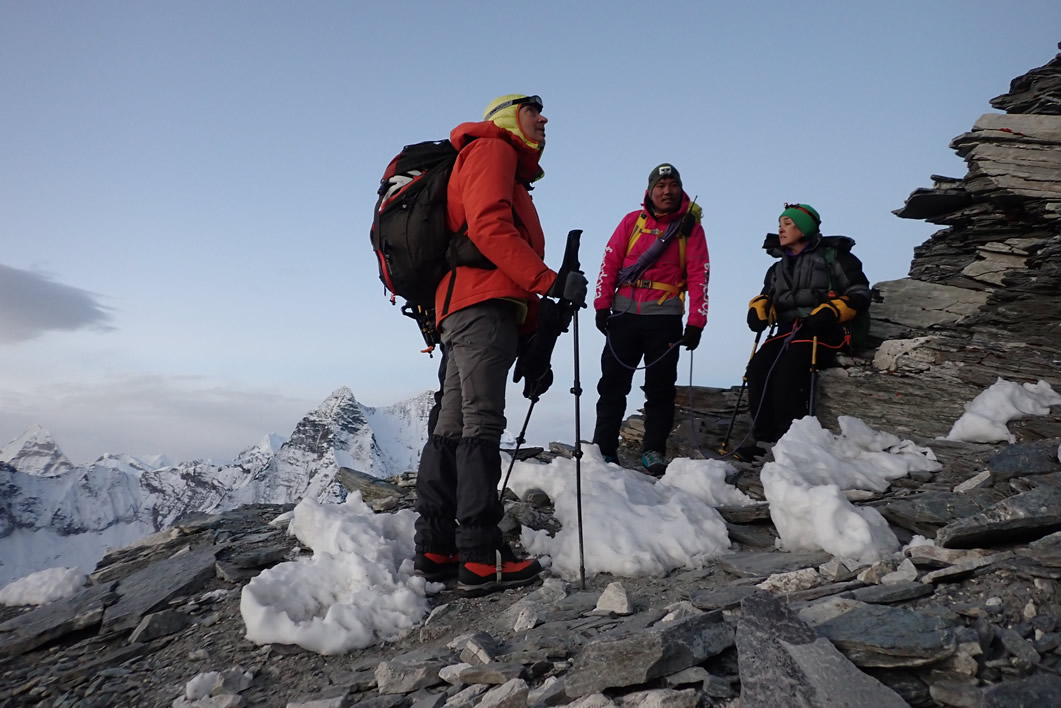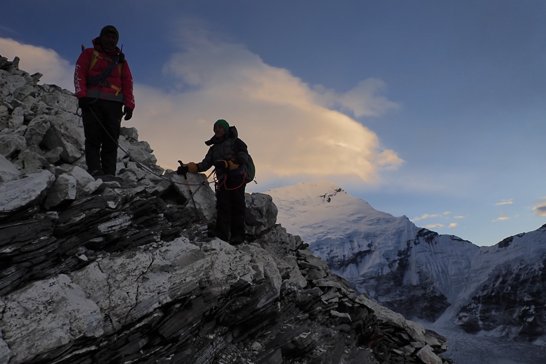 Curiosamente hablando con Javi Berenguer que vinieron días después y ascendieron el Island Peak, su guía español no les llevó en la subida por el rappel volado, sino que lo rodeo por arriba siguiendo el glaciar recto, y girando al poco hacia la izquierda. Solo lo hicieron de bajada. Cosa que me hace pensar si Prem y el guía conocían esta otra subida o querían impresionarnos, asustarnos, con esta del rappel volado… Y las cuerdas fijas de la barrera rocosa, arriba del glaciar, para subir a lomos de la cresta, nos comenta anécdotas de casos, turnos para subir, bajar, colapso y malas sensaciones… incluso Zaida nos cuenta que en la cima, había un grupo de montañeros que estaban tan cansados, que tuvieron que llamar a un helicóptero para bajarlos. Increíble. Esta montaña había dejado de ser un objetivo fácil que se hace “de pasada” a la vez que haces un trekking por el Himalaya. Era mejor aclimatarse y dedicar la actividad específicamente para ascenderla, como hicieron Javi y Zaida. Aún así es muy esforzada, sufrida.