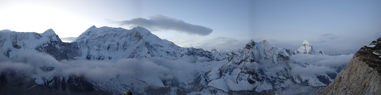 Panorámica en el ascenso al Island Peak, Imja Tse, de izquierda a derecha: Numri (6.635 mts.), Kali Himal (6.985 mts.), Amphu I (6.740 mts.), al fondo posiblemente aparece la punta del Peak 41 (6.648 mts.), las puntas de la zona del Amphu Labsta, y Ama Dablam (6.814 mts.)